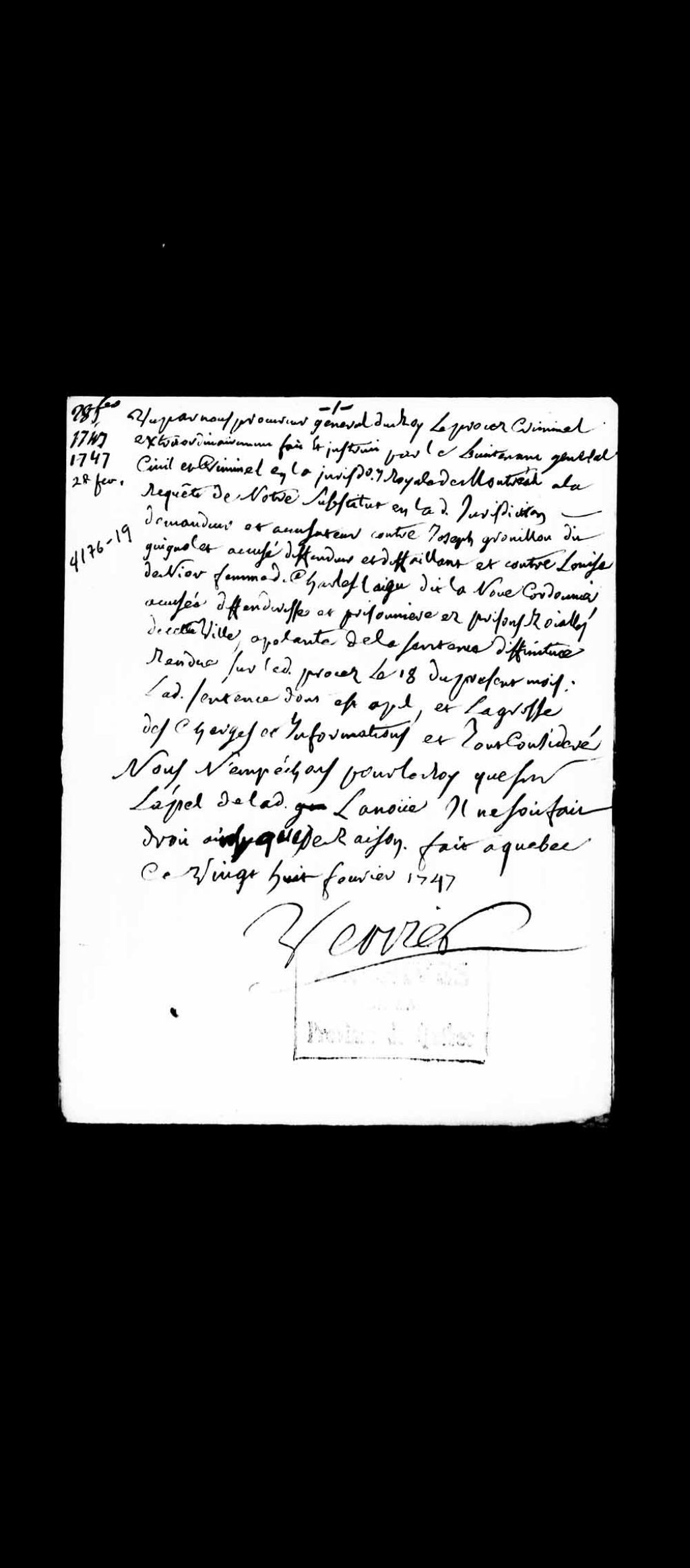 Conclusions du procureur général du Roi au Conseil supérieur de Québec, Louis-Guillaume Verrier, sur l'appel de la sentence du 18 février 1747, dans le cadre du procès criminel extraordinairement fait et instruit par le lieutenant général civil et criminel en la Juridiction royale de Montréal, contre Joseph Grouillon (Gouriou) dit Guignolet, accusé d'avoir vendu et distribué de l'eau-de-vie (alcool) aux Sauvages (Amérindiens), et Louise Lanior, femme de Charles Laigu dit LaNoüe (Lanoue), cordonnier, accusée d'avoir vendu et distribué des couvertes et de l'eau-de-vie (alcool) aux Sauvages (Amérindiens), appelants, 28 février 1747, Archives nationales à Québec, Collection Pièces judiciaires et notariales, (03Q,TL5,D4176-19).