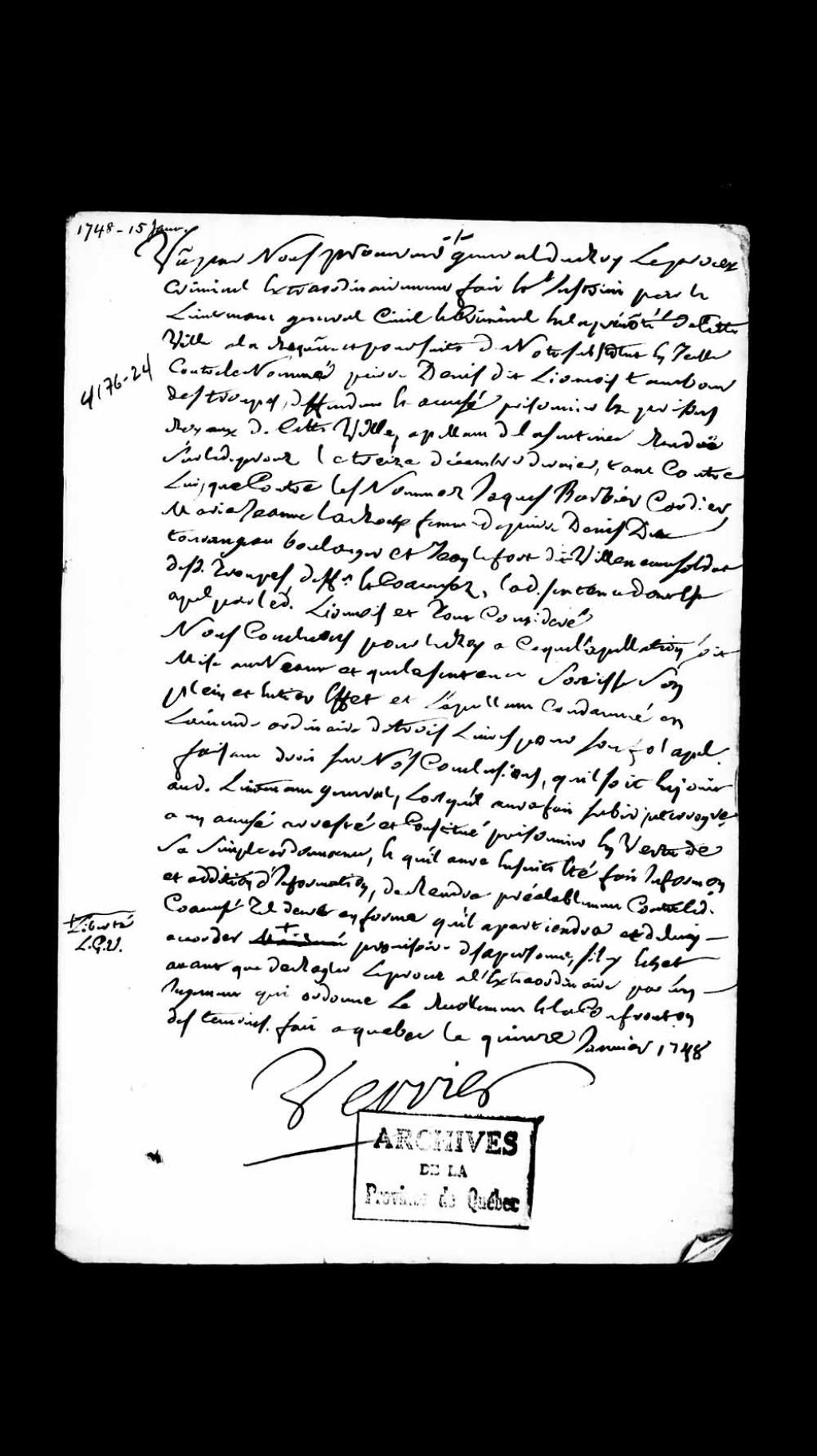 Conclusions du procureur général du Roi au Conseil supérieur de Québec, Louis-Guillaume Verrier, sur l'appel de la sentence du 13 décembre 1747, rendue dans le cadre du procès criminel extraordinairement fait et instruit par le lieutenant général civil et criminel en la Prévôté de Québec, contre Pierre Denis dit Lyonnais, tambour dans la compagnie de Cabanac, accusé de vols de nuit, Jacques Barbier et Marie-Jeanne Laroche, femme de Pierre Denis dit Tourangeau, boulanger, accusés d'avoir recelé les objets volés par ledit Lyonnais, et Jean Lefort dit Villeneuve, soldat, accusé d'avoir volé des papiers dans les poches dudit Lyonnais, appelants