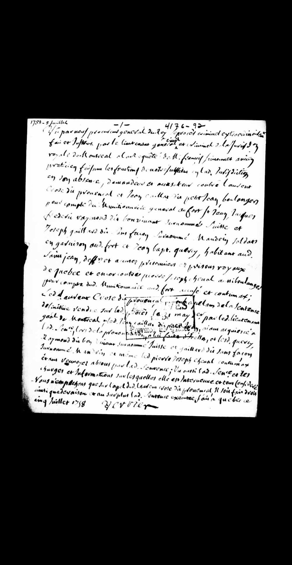 Conclusions du procureur général du Roi au Conseil supérieur de Québec, Louis-Guillaume Verrier, sur l'appel de la sentence du 31 mai 1758, rendue dans le cadre du procès criminel extraordinairement fait et instruit par le lieutenant général civil et criminel en la Juridiction royale de Montréal, à la requête de François Simonnet, ancien praticien, faisant les fonctions de substitut en son absence, contre Laurent Crose (Croze) dit Provençal et Jean Caillat (Caillé - Cayer) dit Petitjean (Petit jean), boulangers pour le compte du munitionnaire général du fort Saint-Jean, Jacques-Frédéric Raymond dit Bouvivant, surnommé Suisse, et Joseph Gaillard dit Sansfaçon, surnommé Mandrin, soldats en garnison au fort Saint-Jean, et Jean-Baptiste Quercy, habitant de Saint-Jean, et encore contre Pierre-Joseph Cheval, aussi boulanger, par contumace; ledit Caillat (Caillé) dit Petitjean (Petit Jean) seront condamné à être admonesté (remontrances), et les nommés Quercy, Raymond dit Bouvinaut et Gaillard dit Sansfaçon, seront absous