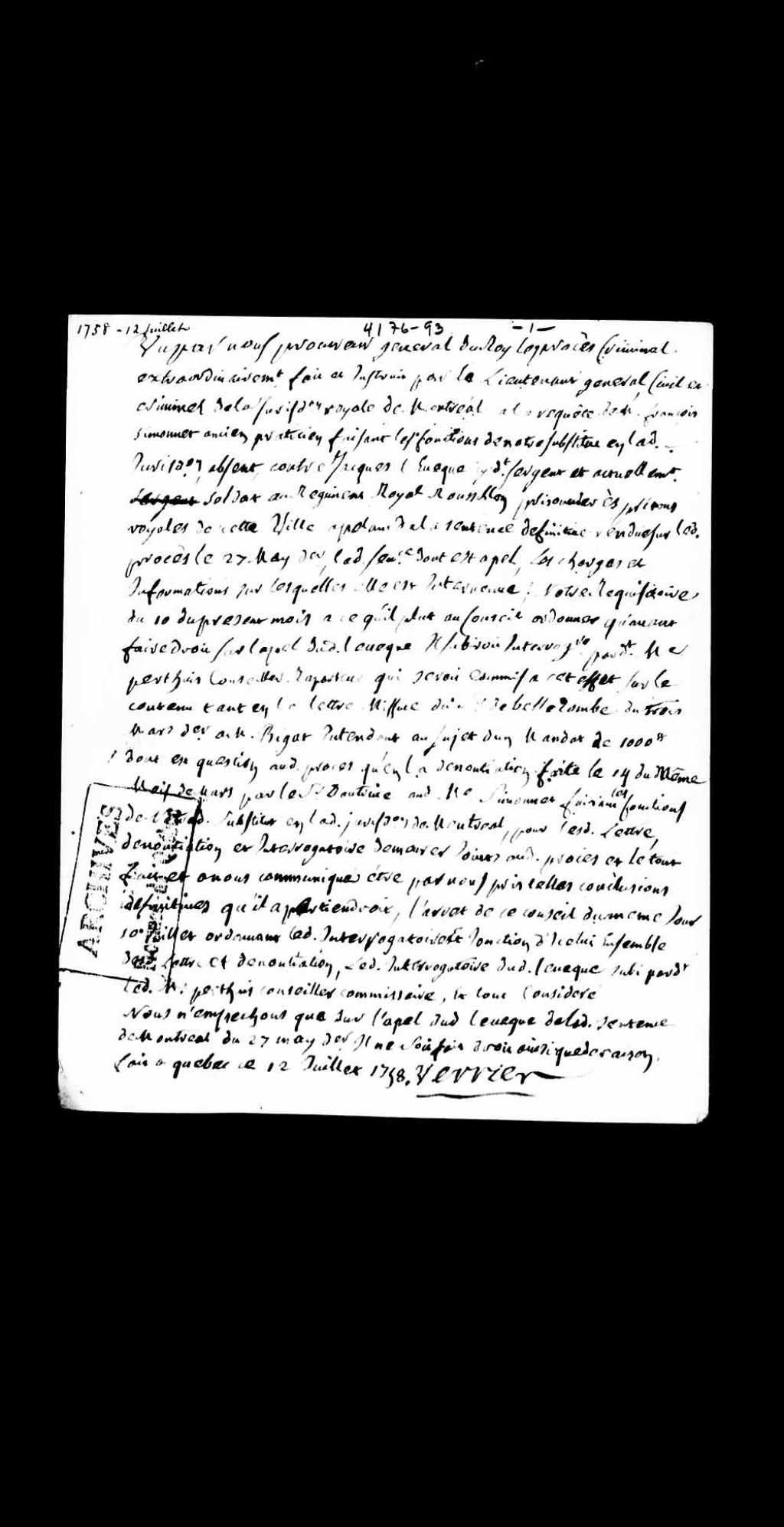 Conclusions du procureur général du Roi au Conseil supérieur de Québec, Louis-Guillaume Verrier, sur l'appel de la sentence du 27 mai 1758, rendue dans le cadres du procès criminel extraordinairement fait et instruit par le lieutenant général civil et criminel en la Juridiction royale de Montréal, à la requête de François Simonnet, ancien praticien, faisant les fonctions de substitut en son absence, contre Jacques Lévesque, sergent et actuellement soldat au régiment Royal Roussillon, accusé d'avoir fabriqué et signé un mandat de mille livres (monnaie) et appelant, 12 juillet 1758, Archives nationales à Québec, Collection Pièces judiciaires et notariales, (03Q,TL5,D4176-93).