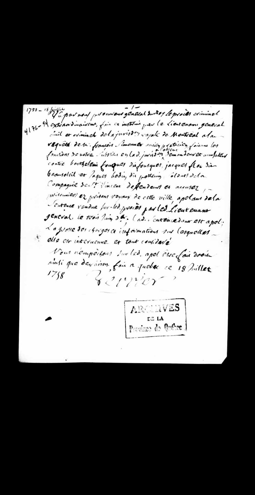 Conclusions du procureur général du Roi au Conseil supérieur de Québec, Louis-Guillaume Verrier, sur l'appel de la sentence du 3 juin 1758, rendue dans le cadre du procès criminel extraordinairement fait et instruit par le lieutenant général civil et criminel en la Juridiction royale de Montréal, à la requête de François Simonnet, ancien praticien, faisant les fonctions de substitut en son absence, contre Barthélemy Fouque dit Fouquet, Jacques Floc dit Beausoleil et Jacques Beaudin dit Potvin, soldats de la compagnie de Saint-Vincent, appelant, 18 juillet 1758, Archives nationales à Québec, Collection Pièces judiciaires et notariales, (03Q,TL5,D4176-94).