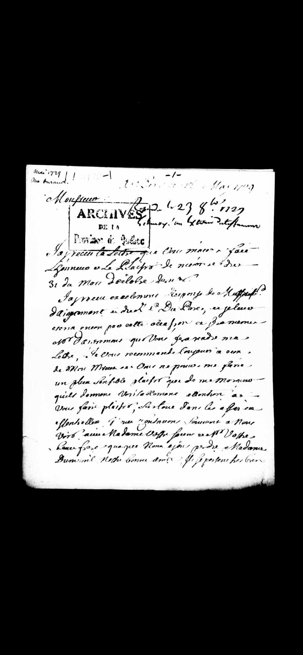 Lettres du sieur Durand de Paris, adressées à Louis-Guillaume Verrier, procureur général du Roi au Conseil supérieur de Québec