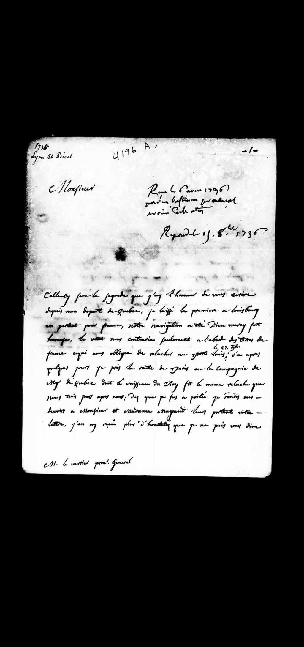 Lettres de l'abbé Jean Lyon de Saint-Férréol, adressées à Louis-Guillaume Verrier, procureur général du Roi au Conseil supérieur de Québec, 4 novembre 1735 - 9 juin 1737, Archives nationales à Québec, Collection Pièces judiciaires et notariales, (03Q,TL5,D4196).