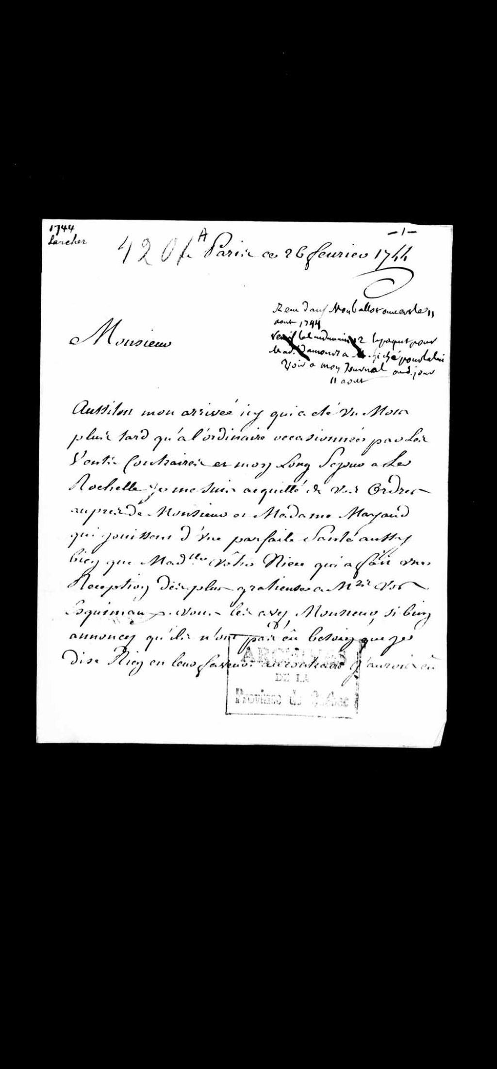 Lettres du sieur E. Larcher, de Paris, adressées à Louis-Guillaume Verrier, procureur général du Roi au Conseil supérieur de Québec