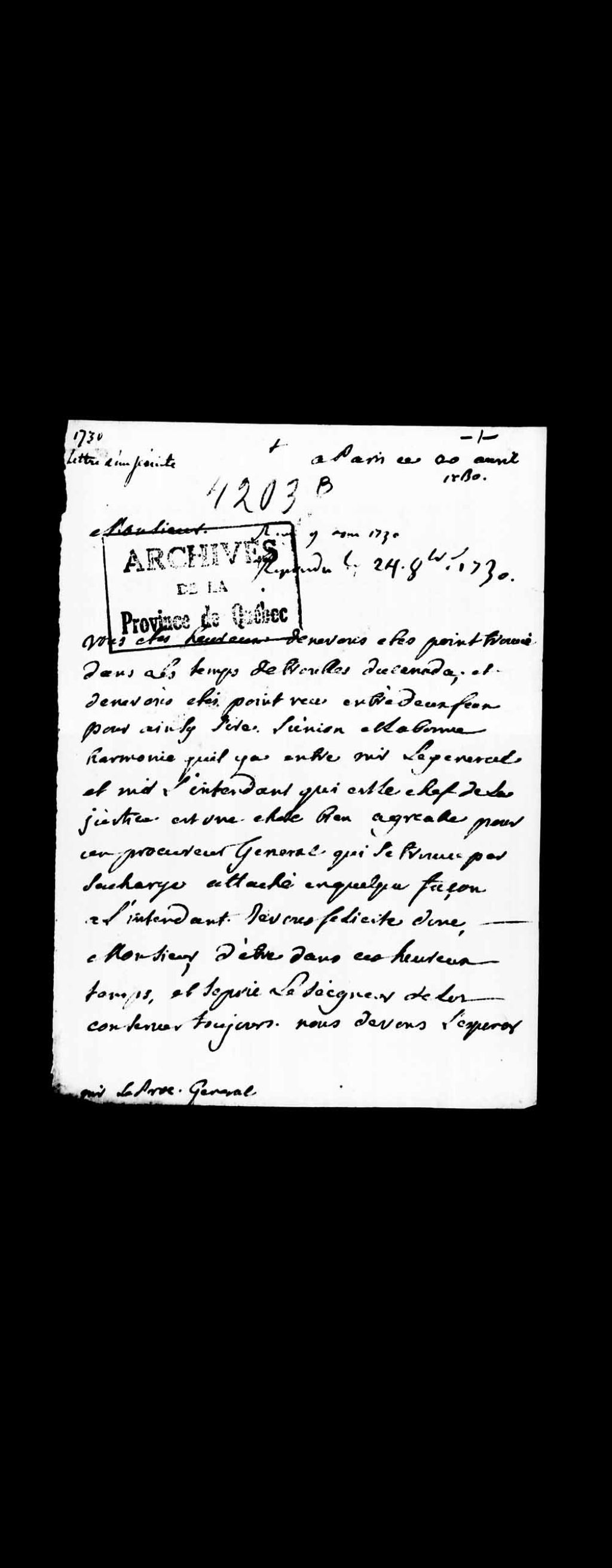 - Ce dossier comprend onze lettres, avec parfois le brouillon de la réponse de Verrier au verso des lettres; le sieur Descloseaux (2 lettres) discute des changements au Canada, assure Verrier que l'on juge sa conduite «irréprochable et qu'il n'a eu lieu que d'être très content de la manière dont vous (avez agit) comme vous le verrez par la lettre de monsieur de Maurepas» et lui donne les dernières nouvelles concernant le Roi et la Reine de France; Tourton de Clairefontaine (une lettre) lui transmet avec sa lettre envoyée de Montréal, le dossier (requête, assignation pour le 13 septembre prochain et les réponses au prétendus griefs) de la cause du sieur Daussy, cause de laquelle il discute; Huel (3 lettres) lui donne des nouvelles de France, le félicite d'avoir choisi de partir en Nouvelle-France, car «les affaires du Palais déclinent de plus en plus, et les avocats augmentent»; Angers (2 lettres - l'une sans date et l'autre concernant l'île Saint-Jean ) lui parle d'une caisse de livres qu'il a rangé par matières chez madame Caron, où il pourra venir les examiner afin d'en trouver quelques uns qui seront à son goût, ainsi que de la nomination d'un commandant au port des Trois-Rivières (Jean-Pierre Roma), île Saint-Jean, le sieur Descouts, chargé des passeports de monsieur l'Amiral est en France, du besoin des habitants de l'île (Compagnie de l'Est de l'Île Saint-Jean) en vivres pour l'hiver et l'organisation prochaine d'une expédition vers Québec pour remédier à la situation; Heaujon fils (une lettre) qui est charmé que Verrier ait reçu son beau livre de Saint Antoine de Cherbourg ainsi qu'un ballot et l'invite à faire passer ses autres livres par lui, tant que la guerre durera à La Rochelle; Bescampes (une lettre) informe Mayaud, beau-frère de Verrier, à Paris, qu'un ballot pour Verrier n'est pas arrivé à temps pour être embarqué dans le navire de monsieur Desaunier et qu'il s'est occupé de charger ledit ballot et d'en payer les droits