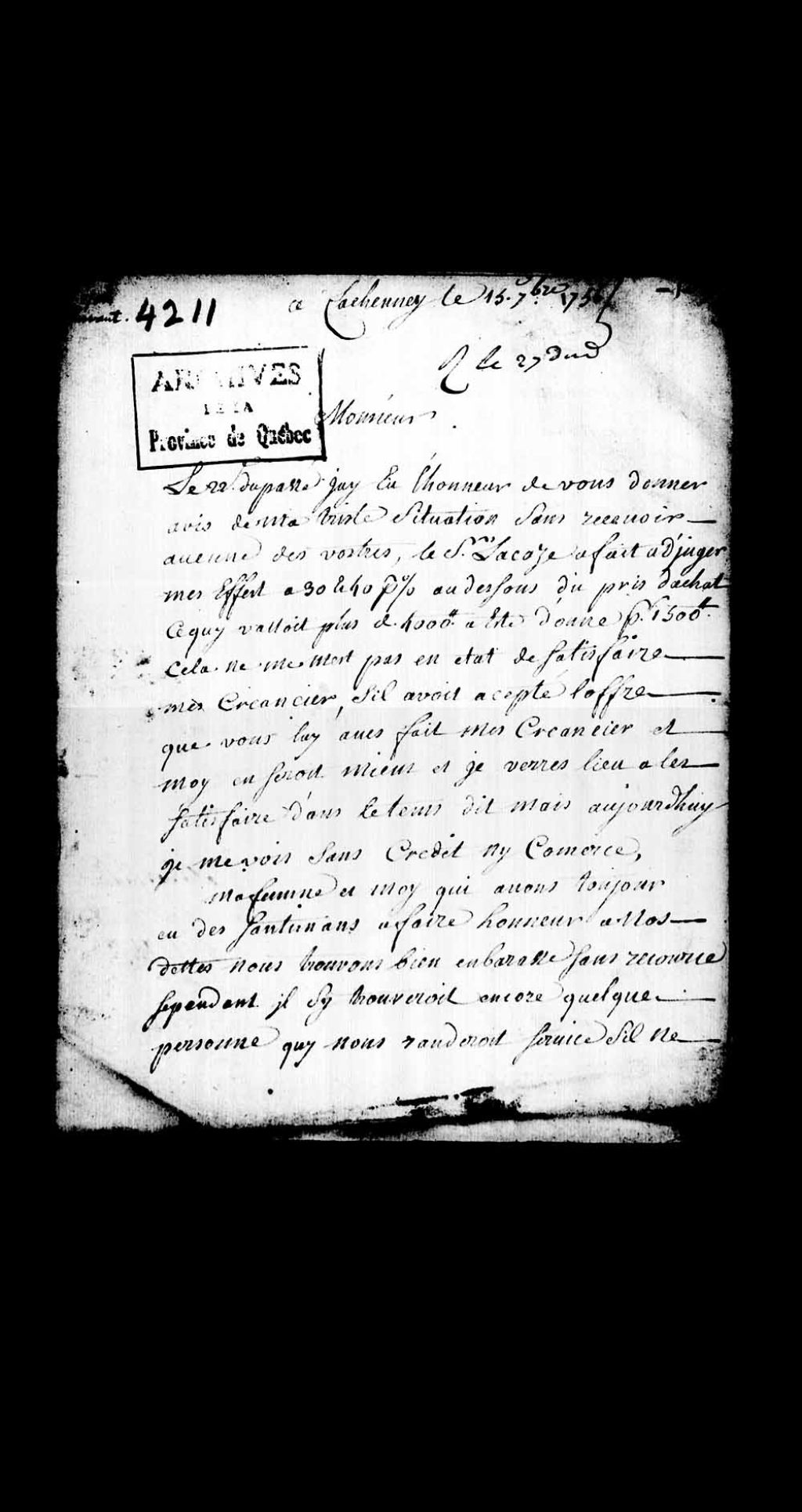 Lettre de Servant, envoyée de Lacheney (Lachenney - Lachenaie), à Louis-Guillaume Verrier, procureur général du Roi au Conseil supérieur de Québec, a qui il se plaint de sa mauvaise situation financière et de l'adjudication de ses biens en dessous de leurs valeur, ce qui ne satisfait pas ses créanciers, 15 septembre 1756, Archives nationales à Québec, Collection Pièces judiciaires et notariales, (03Q,TL5,D4211).