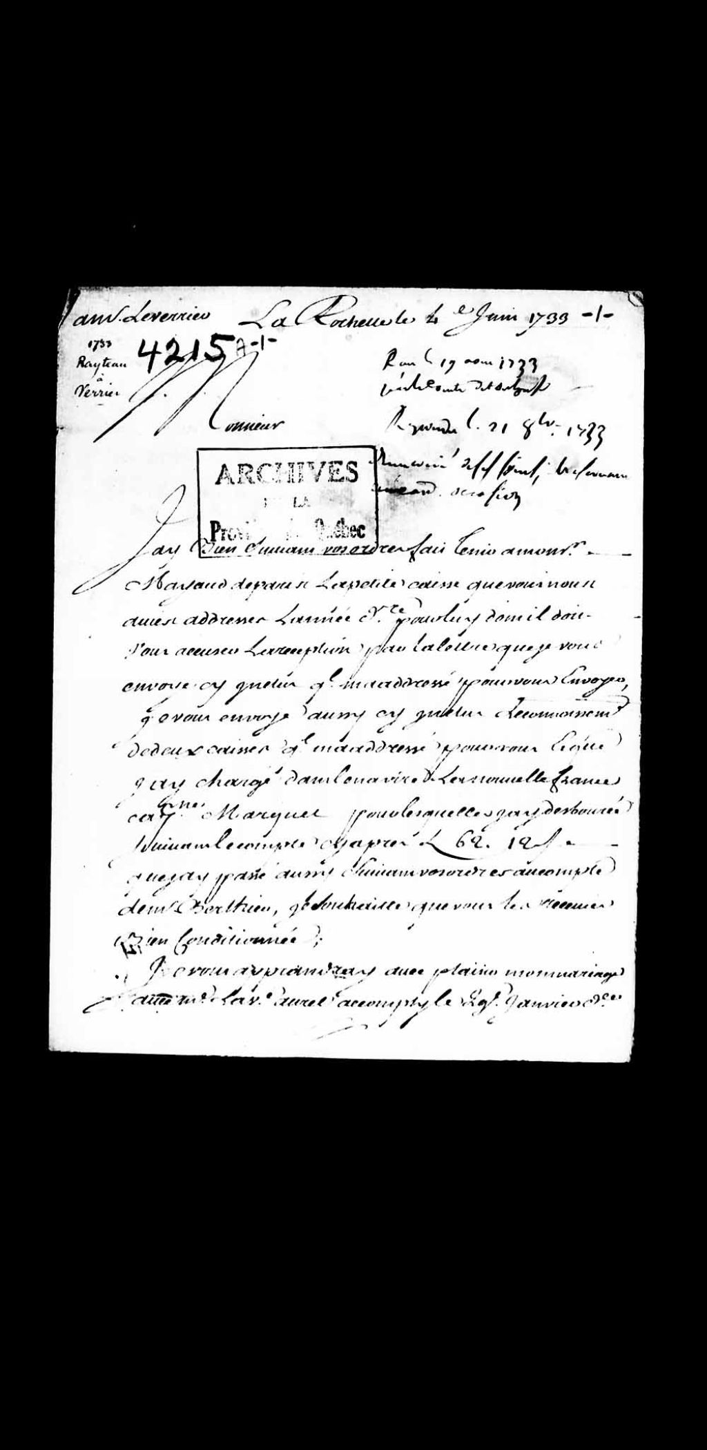 - Lettres de monsieur Rayteau, à La Rochelle, adressées à Louis-Guillaume Verrier, procureur général du Roi au Conseil supérieur de Québec, concernant l'acheminement de petites caisses
