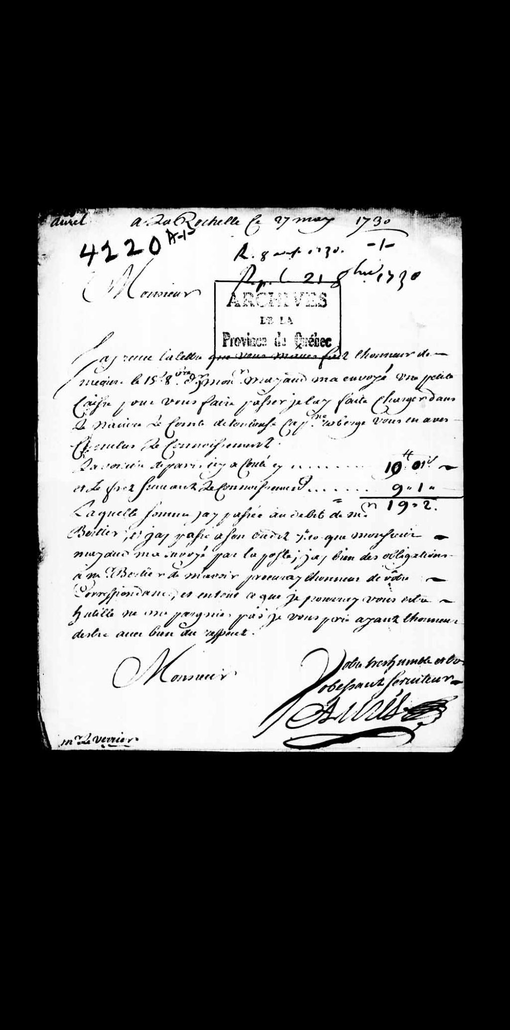 Lettres de monsieur Aurel (Aurès), puis de sa veuve, en association avec le sieur Rayteau, de La Rochelle, adressées à Louis-Guillaume Verrier, procureur général du Roi au Conseil supérieur de Québec
