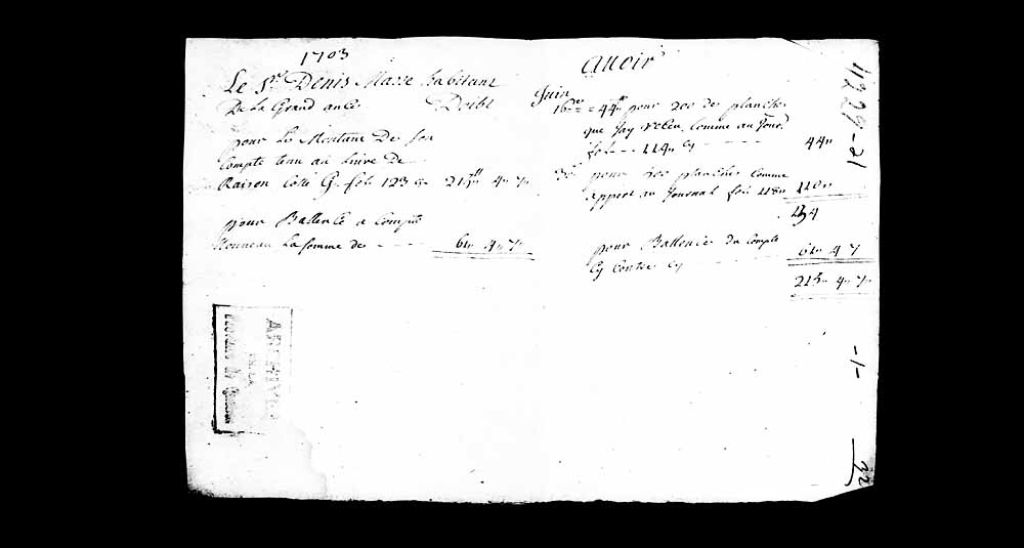 Compte du sieur Denis Masse, habitant de la Grande-Anse, extrait du «grand livre de raison», comme débiteur et créditeur, de divers effets dont des planches de bois, 16 juin 1703 au 30 juin 1703, Archives nationales à Québec, Collection Pièces judiciaires et notariales, (03Q,TL5,D4229-21).