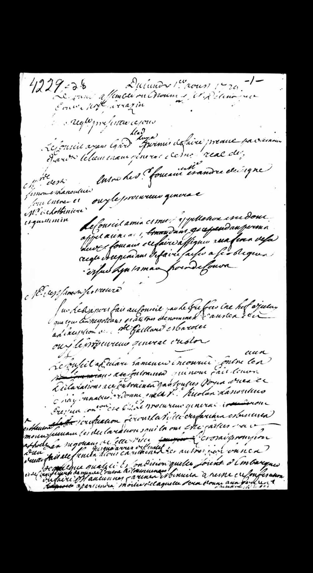 Procès-verbal d'une audience tenue au Conseil supérieur de Québec, le 1er août 1729, comprenant plusieurs arrêts : une appellation mise à néant, d'une sentence du lieutenant général civil et criminel de Montréal intervenue entre le sieur François Foucault et André de Leigne, portant permission au sieur Foucault de faire assigner aux fins de sa requête et cependant de faire saisir à ses risques, périls et fortune; les nominations de Nicolas Lanoullier, Jean Crespin (Crépin) et le procureur général du Roi, pour faire la visite des farines et biscuits, suivant les déclarations qui ont été faites par les marchands de Québec et défense à tous capitaines d'embarquer aucunes farines, blés et biscuits à peine de confiscation et de 500 livres d'amende; une appellation et sentence mises à néant dans la cause entre Jean Crespin (Crépin), conseiller, appelant de sentence en l'Amirauté de Québec du 23 juillet 1729, et François Margane de Lavaltrie, intimé et ledit Margane de Lavaltrie est condamné à payer à Crespin (Crépin) 2161 livres sur les effets venus cette année du poste de Labrador