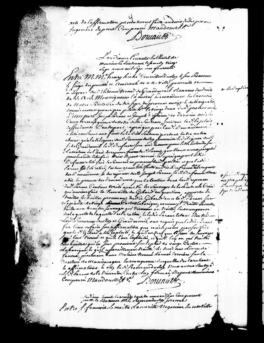 Ordonnance du lieutenant général de l'Amirauté de Québec, Nicolas-Gaspard Boucault, dans le procès de Henry Hiché, conseiller du Roi et procureur du Roi au siège de la Prévôté et Amirauté de Québec, à la poursuite et à la diligence de Etienne Veron de Grandmesnil, receveur des droits de S.A.S. Monseigneur l'amiral, demandeur, et Joseph Parent (Parant) et Joseph Dufresne, qui renvoie la demande formée contre le demandeur, concernant la découverte d'un gibard (baleine) échouée sur les battures de la Manicouagan, par les Sauvages (Amérindiens) de la Pointe-à-la-Croix, 27 août 1740, Archives nationales à Québec, Collection Pièces judiciaires et notariales, (03Q,TL5,D4229-40E).