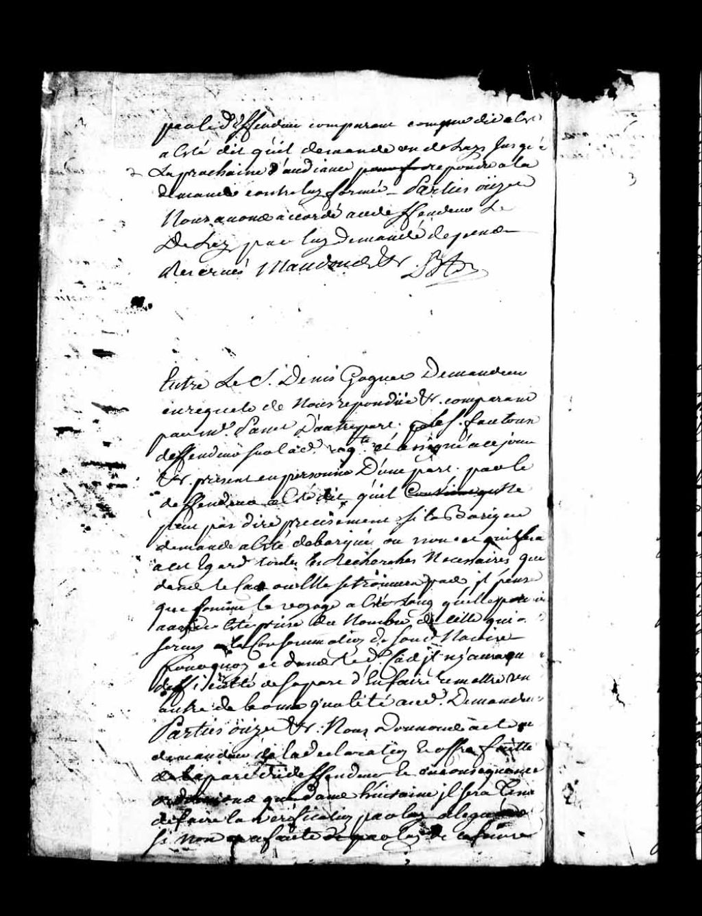 Ordonnance du lieutenant général de l'Amirauté de Québec, Nicolas-Gaspard Boucault, dans le procès entre le sieur Denis Gagné (Gagner), demandeur, comparant par maître Panet, et le sieur Fautour (Fautoux), défendeur, concernant une barrique de vin, qui donne acte au demandeur de la déclaration et offre faite par ledit défendeur; en conséquence, il sera tenu de faire dans huitaine, la vérification des faits allégués par le défendeur, sinon celui-ci est condamné à fournir et livrer au demandeur, une barrique de vin de bonne qualité, 10 octobre 1746, Archives nationales à Québec, Collection Pièces judiciaires et notariales, (03Q,TL5,D4229-43C).