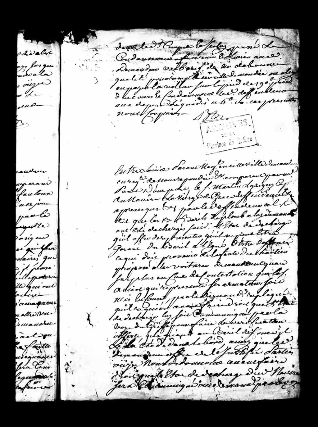 Ordonnance du lieutenant général de l'Amirauté de Québec, Nicolas-Gaspard Boucault, dans le procès entre Louis Parent (Parant), négociant de Québec, demandeur, comparant par maître Panet, et Martin Larigny, capitaine du navire «la Vierge de Grâce», défendeur, concernant 13 barils de plomb; avant de faire droit, l'état de la décharge dudit navire sera communiqué audit demandeur et que Amiot, armateur dudit navire sera mis en cause, à la diligence dudit demandeur, 10 octobre 1746, Archives nationales à Québec, Collection Pièces judiciaires et notariales, (03Q,TL5,D4229-43D).