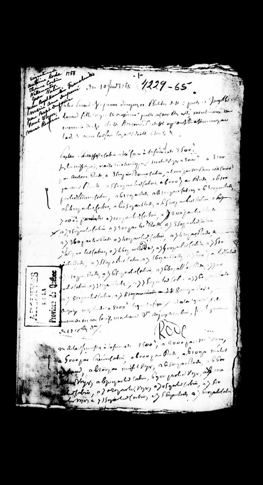 - Ce dossier en matières civiles provient de la Prévôté de Québec et comprend des ordonnances et l'audience des procès suivants: Emond, demandeur, et Philibot et Josephte Lanaud, fille; vente par adjudication où Antoine Rode est désigné comme adjudicataire, au nom de Marie-Louise Marchand, veuve de Joseph Corbin; vente par adjudication où Étienne Corbin est désigné comme adjudicataire; le sieur Duchenay, comparant par Lamorille, et le sieur Taché, comparant par Decharnay; Maurice (Jeanin), comparant par Marie Bouffard, sa femme et Philibot, défendeur; dépositions de Louis Falardeau, demeurant rue Saint-Jean, âgé de 26 ans et Ignace Constantineau, âgé de 28 ans, dans le cadre du procès les opposant à Marie-Charlotte Parent, veuve Gastonguay (Castonguay), demanderesse; Henri Lebreton, demandeur, et Françoise Lecourt (Lecours); Henri Lebreton, demandeur, et Françoise Lecourt (Lecours), Louise et Joseph Lecourt; Taché, comparant par maître Decharnay, et Gabriel Maranda, défendeur; Desgranges (de Grange) et de Longueuil; Ignace Rousseau (Roussy - Rousseau), demandeur, et Philibot, défendeur; veuve Legris, comparante par Decharnay, et Thibault (Thibaut), comparant par Clesse; Alexis Gauvreau et Jeaumain (); Alexandre Saint-Pierre et Alexandre Dubé; Paul Côté (Costé), demandeur comparant par Decharnay, et L. Aubry, défendeur; Joseph (), demandeur, et le nommé Lagrenade (la Grenade), François Beauval (Bauval - Beauvais), Geneviève Beaudoin (Joneau - Jaunau) et Gabriel Attina, son mari, défendeurs; dépositions de différents témoins dans le cadre d'un procès opposant la dame Marie-Josephte Lamorille, demanderesse, et une personne non identifiée [monsieur de Villemonté, capitaine des grenadiers du régiment de Berry, demeurant rue Saint-Joseph, 50 ans; Jean Valin, demeurant rue Saint-Joseph, âgé de 66 ans; Catherine Dubreuil, femme de Jean Valin, âgée de 50 ans; Jean-Baptiste Hamelin de Francheville, âgé de 45 ans, demeurant rue Saint-Jean; Marie-Madeleine Gilbert, femme de Mathurin Morier (Morrier - Maurier), demeurant rue Saint-Joseph, âgé de 50 ans; Marie-Anne Dupéré, femme de Jean Mony, âgée de 40 ans; Geneviève Morier, demeurant chez son père, âgée de 14 ans; Jacques Deguise (de Guise) le Flamand, demeurant rue Saint-Jean, âgé de 63 ans]; ventes par adjudication de divers emplacements et maisons, dont l'une située rue Notre-Dame, et une autre, rue du Sault-au-matelot, et où Jean-Baptiste Dufour, la veuve Riverin et Audy (Audet) sont désignés comme adjudicataires; le sieur Barbel, comparant par maître Decharnay, et la veuve Fornel, comparant par Dulaurent; défaut accordé à Antoine () à l'encontre de François Sylvestre, défaillant à son assignation à comparaître, donnée par exploit de Duhault (Duhaut)