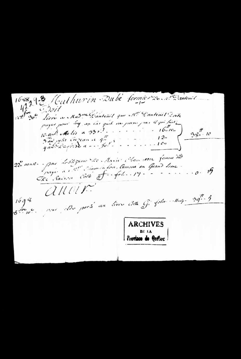 Compte de Mathurin Dubé, fermier de monsieur d'Auteuil, à la Rivière-Ouelle, et Marie Campion, sa femme, extrait du «grand livre de raison», 30 octobre 1688 au 10 octobre 1698, Archives nationales à Québec, Collection Pièces judiciaires et notariales, (03Q,TL5,D4229-8).