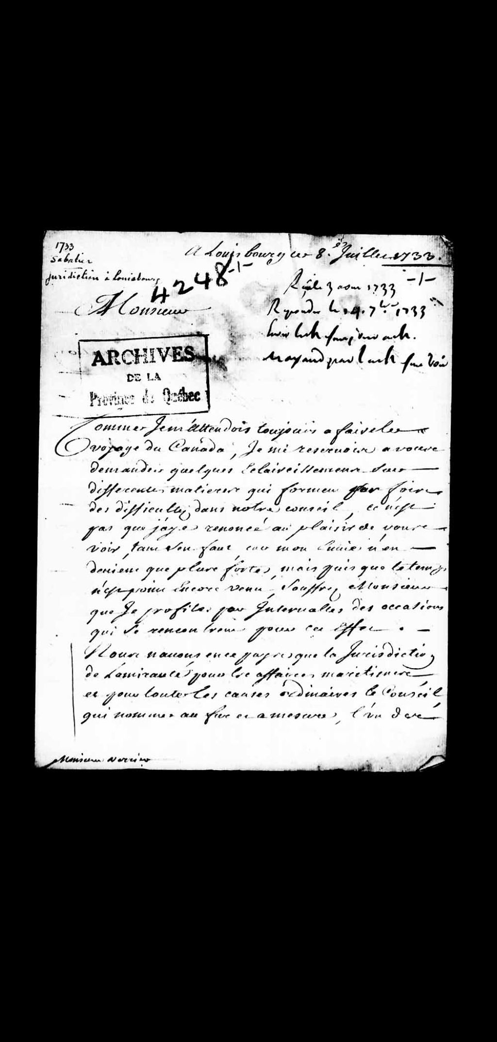 Lettre de monsieur Sabatier, officier de justice à Louisbourg, adressée à monsieur Louis-Guillaume Verrier, procureur général à Québec, 8 juillet 1733, Archives nationales à Québec, Collection Pièces judiciaires et notariales, (03Q,TL5,D4248).