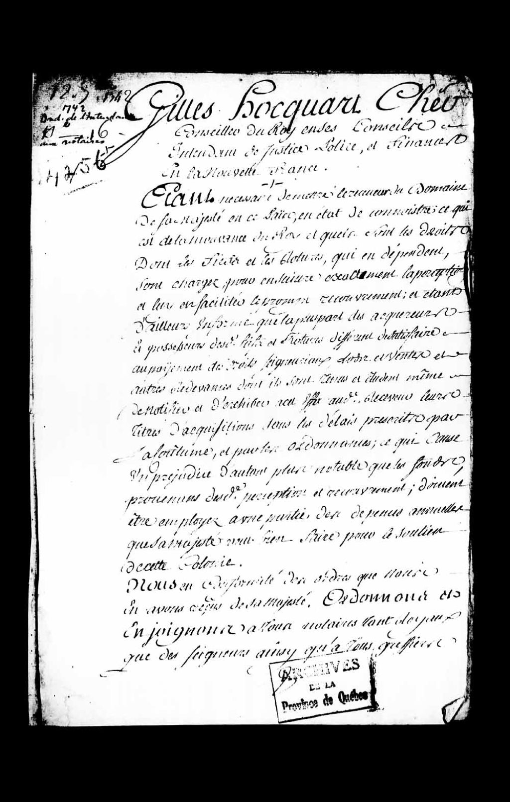 Ordonnance de Hocquart à tous les notaires et greffiers, à propos du paiement des droits seigneuriaux, lots, ventes et autres redevances des fiefs et rotures, afin que soit délivré au receveur du Domaine du Roi, les extraits de tous les contrats de vente, échanges, sentences, arrêts, adjudications, décrets, licitations et jugements concernant la propriété et héritages, depuis le 1er janvier 1740 jusqu'à ce jour, 12 septembre 1742, Archives nationales à Québec, Collection Pièces judiciaires et notariales, (03Q,TL5,D4256).