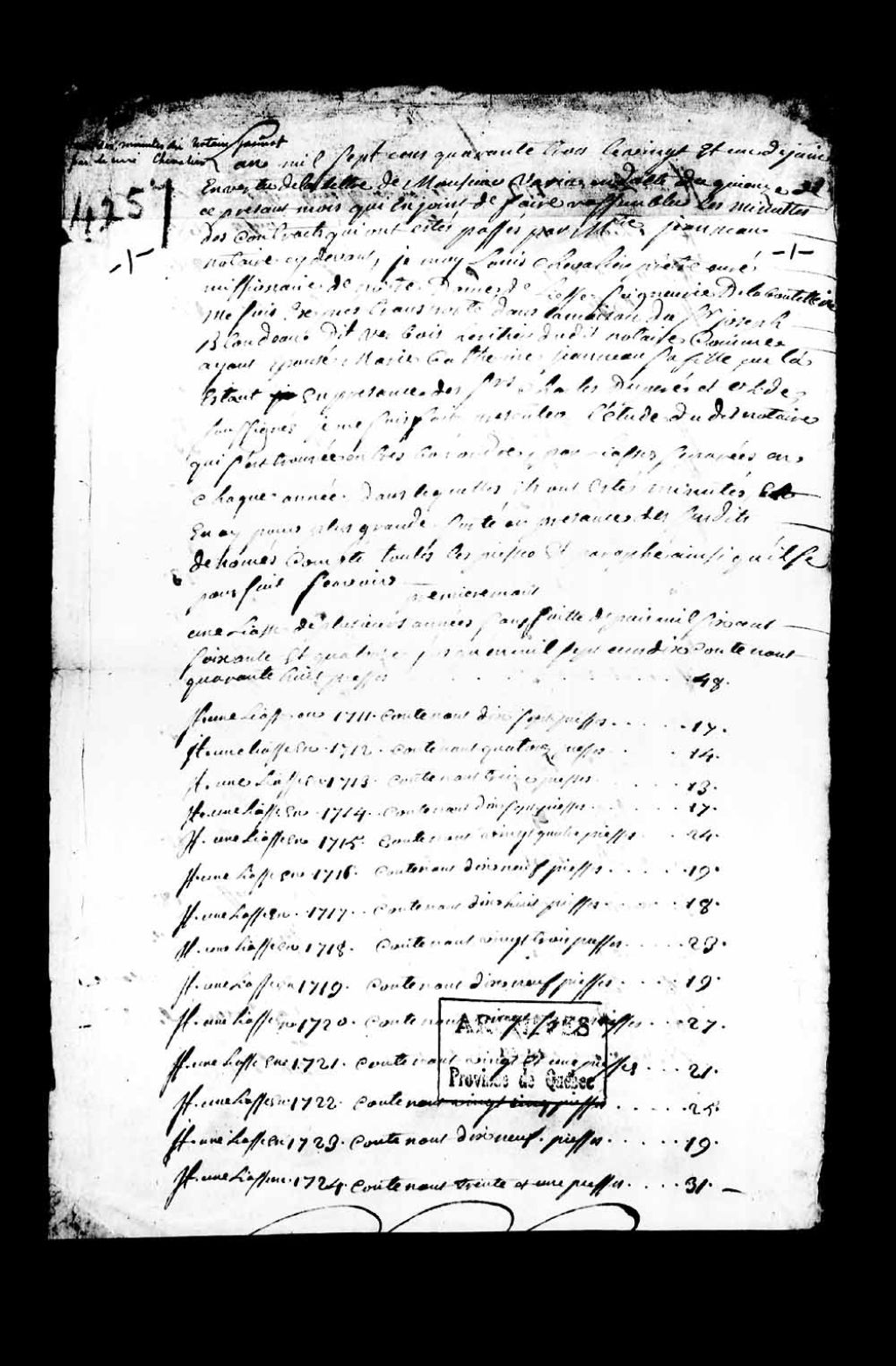 Inventaire des minutes du notaire Étienne Janneau, par Louis Chevalier, prêtre, curé missionnaire de Notre-Dame de Liesse, seigneurie de la Bouteillerie, conservées chez le sieur Joseph Blondeau dit Berbois, héritier dudit notaire et comme ayant épousé Marie Catherine Janneau, sa fille; inventaire fait en vertu d'une lettre de monsieur le Varin (Varia), en date du 15 juin 1743
