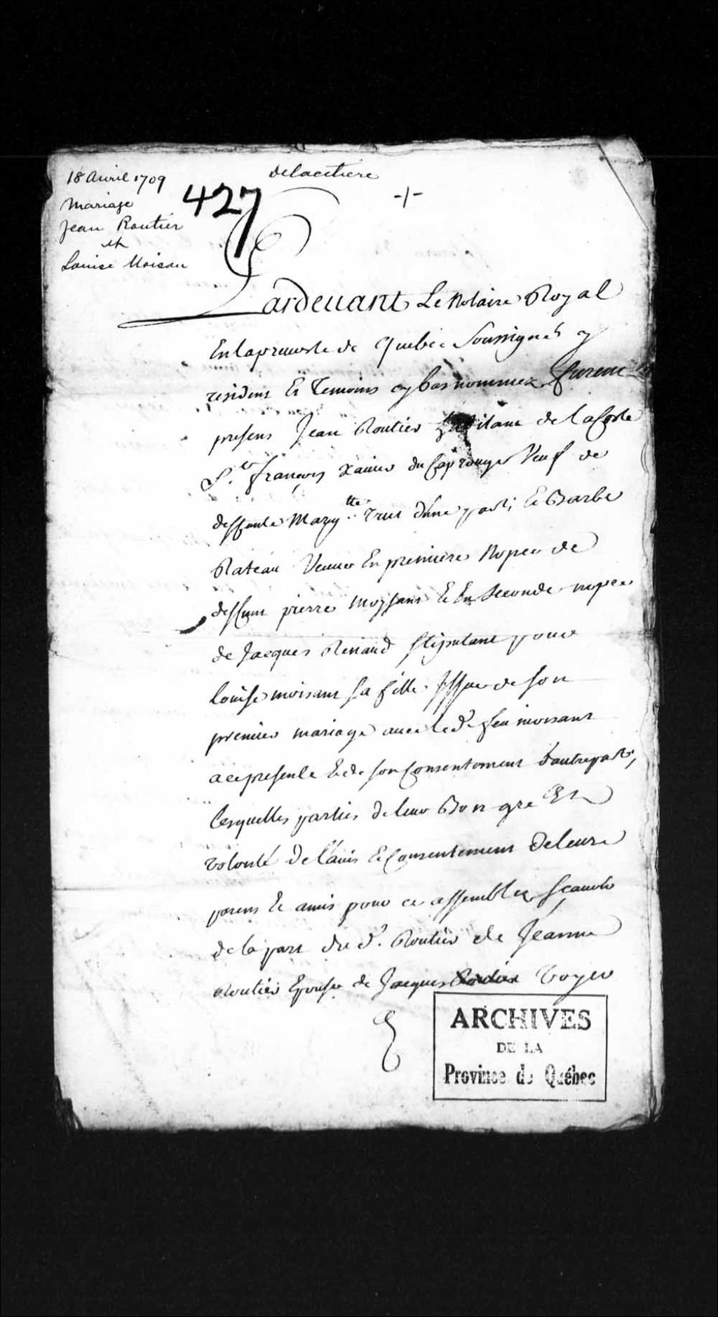Contrat de mariage entre Jean Routhier (Routier), veuf de Marguerite Trut (Tru), habitant de la côte Saint-François-Xavier du Cap-Rouge, et Louise Moisan, fille de Barbe Rateau et de défunt Pierre Moisan, 18 avril 1709, Archives nationales à Québec, Collection Pièces judiciaires et notariales, (03Q,TL5,D427).