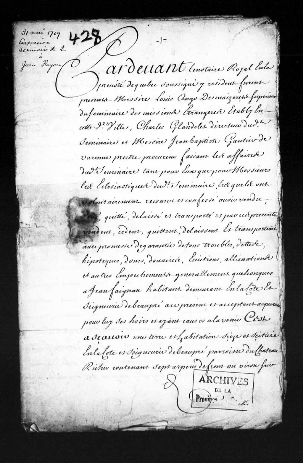 Concession d'une terre par messieurs du Séminaire des Missions étrangères de Québec (Jésuites) à Jean Fagnan (Faignan), habitant de la côte et seigneurie de Beaupré, avec quittance du 12 décembre 1714, 31 mai 1709, Archives nationales à Québec, Collection Pièces judiciaires et notariales, (03Q,TL5,D428).