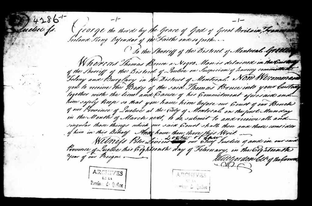 Habeas Corpus en faveur du nègre (noir) Thomas Bruce, détenu par le shériff du District de Québec et soupçonné d'avoir commis un crime et vol (felony and burglary) dans le District de Montréal, donné par Will Gordon, pour la Couronne, 18 février 1778, Archives nationales à Québec, Collection Pièces judiciaires et notariales, (03Q,TL5,D4286).