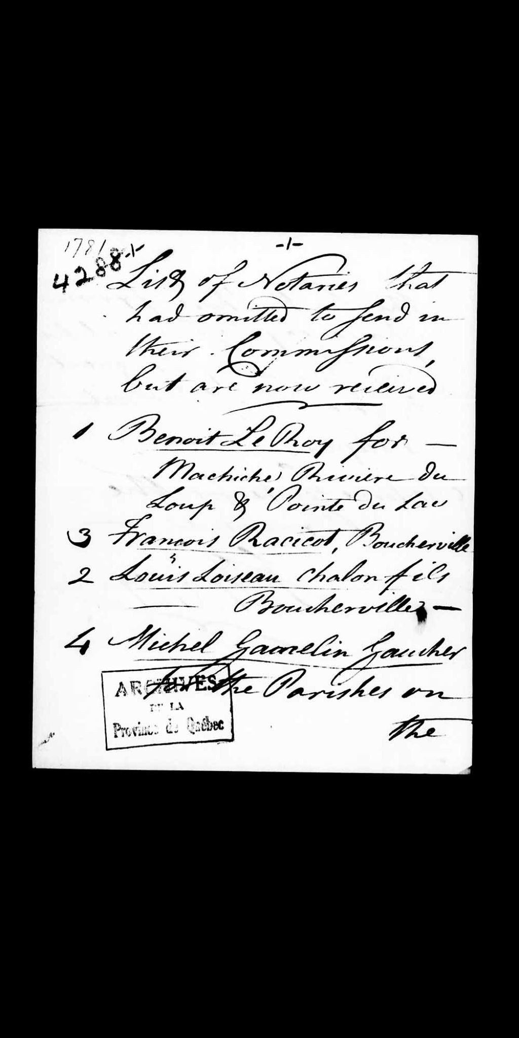 Liste des notaires qui ont omis de transmettre leurs commissions mais qui sont maintenant reçus, soit Benoit LeRoy, pour Machiche, Rivière-du-Loup et Pointe-du-Lac; François Racicot, pour Boucherville; Louis Loiseau Chalon fils, pour Boucherville; Michel Gamelin Gaucher, pour la rive sud de Châteauguay à Sorel inclusivement, la baronnie de Longueuil et la seigneurie de Beloeil exclues; et Antoine Foucher, 1er janvier 1781 - 31 décembre, Archives nationales à Québec, Collection Pièces judiciaires et notariales, (03Q,TL5,D4288).