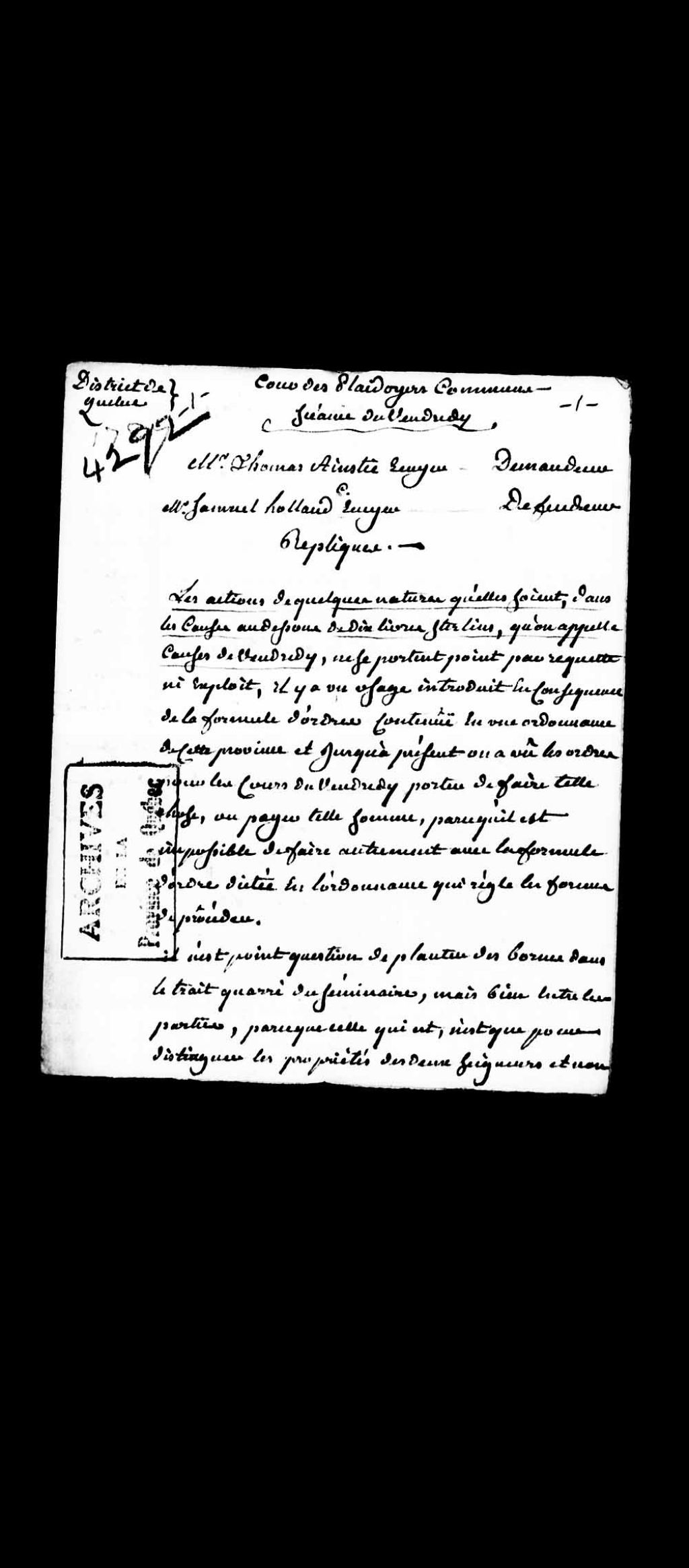 Répliques dans la cause entre Thomas Ainslie, écuyer, demandeur, contre Samuel Holland, écuyer, défendeur, concernant une borne ou clôture entre les propriétés des deux seigneurs; répliques faites dans le cadre des «causes du vendredi» (causes au-dessous de 10 livres sterling), 27 octobre 1787, Archives nationales à Québec, Collection Pièces judiciaires et notariales, (03Q,TL5,D4292).