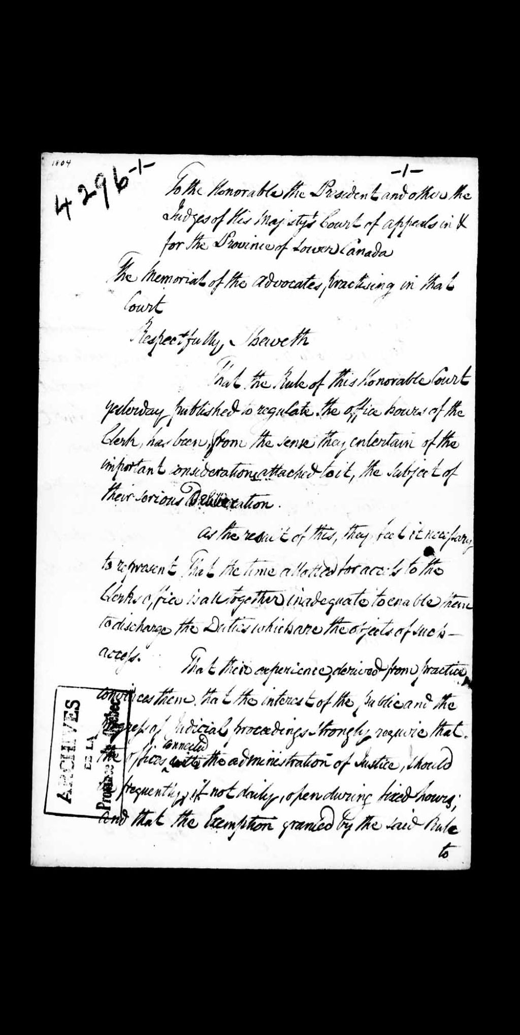 Mémoire des avocats siégeant à la Cour d'appel de la Province du Bas-Canada (the Memorial of the advocates practising in the Court of Appeal), appuyée d'une résolution unanime du barreau, signé par le doyen, Berthelot d'Artigny, 20 novembre 1804, Archives nationales à Québec, Collection Pièces judiciaires et notariales, (03Q,TL5,D4296).