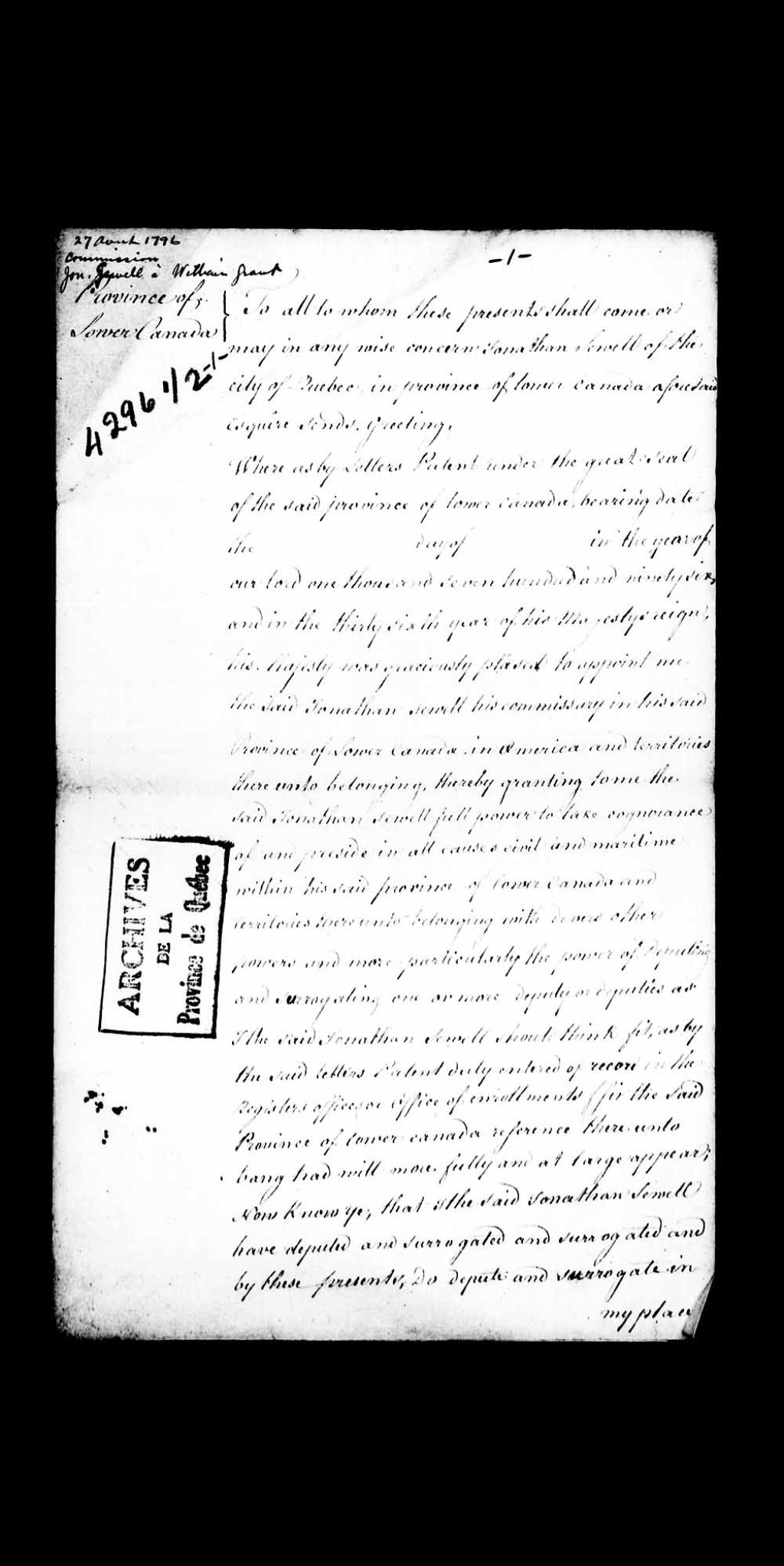 Commission donnée par Jonathan Sewell, de la ville de Québec, dans la Province du Bas-Canada, esquire (écuyer), procureur général et juge dans les causes civiles et maritimes (Cour de la Vice-Amirauté) à William Grant, en tant que son député au greffe ou bureau d'enregistrement (registers office), 27 août 1796, Archives nationales à Québec, Collection Pièces judiciaires et notariales, (03Q,TL5,D4296.2).