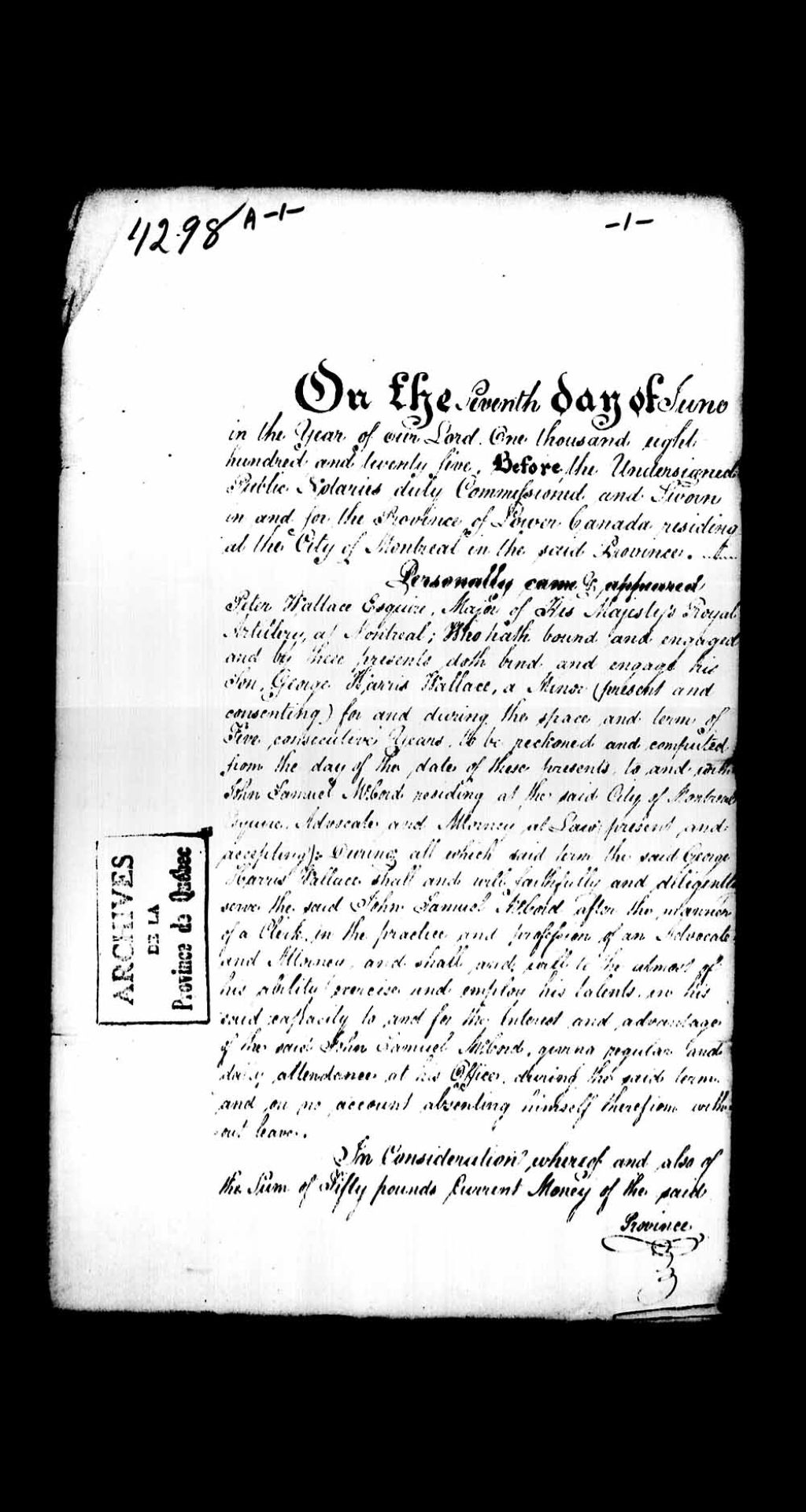 - Admission à la pratique du droit de George-Harris Wallace, mineur (né le 14 juin 1809), sur la requête de son père Peter Wallace, écuyer, major de l'artillerie royal de Sa Majesté britannique à Montréal