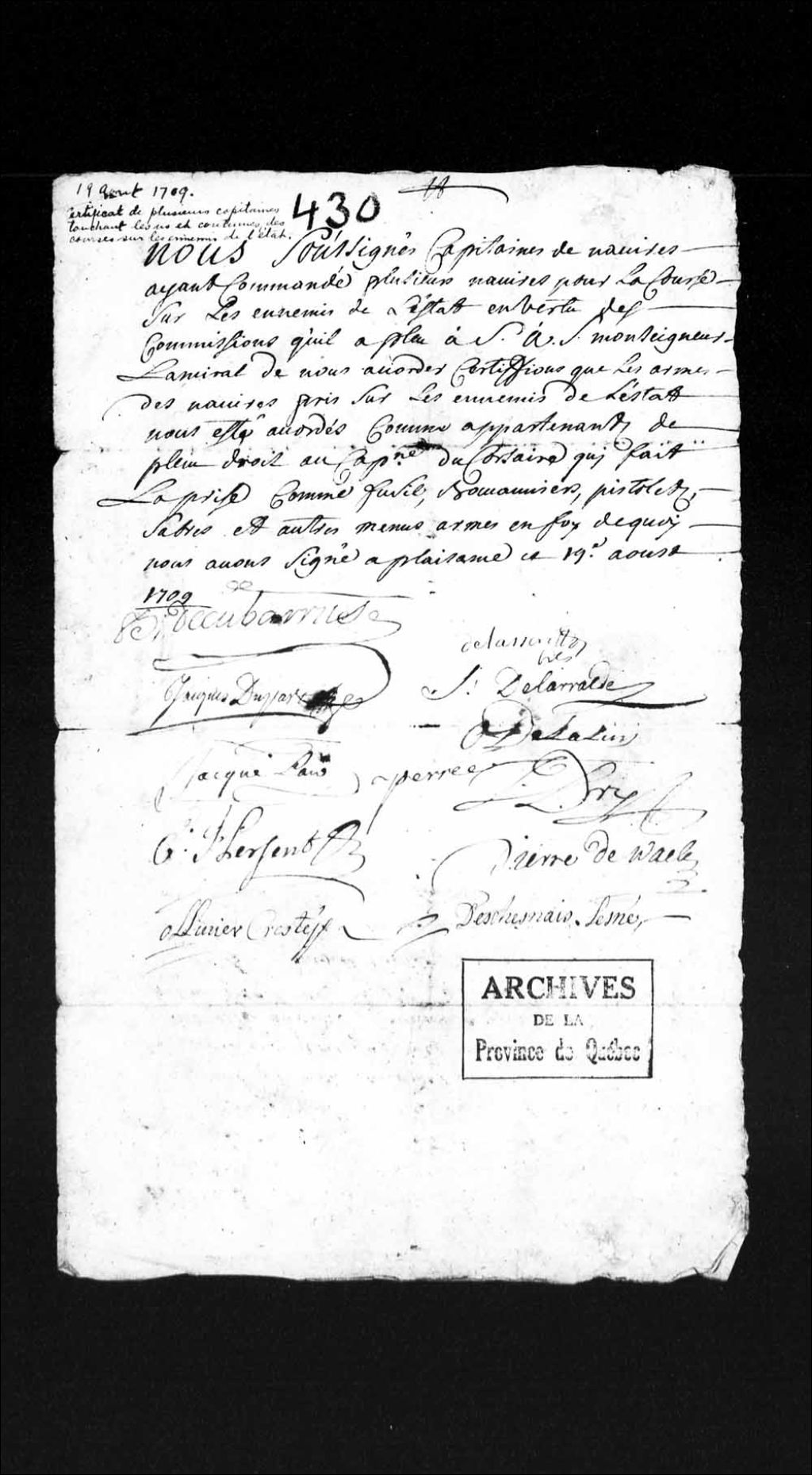 Déclaration signée à Plaisance, Terre-Neuve, de douze capitaines de navires, ayant faits la course sur les ennemis de l'État, en vertu des commissions accordées par monseigneur l'Amiral, selon laquelle, les armes prises leurs sont accordées, 19 août 1709, Archives nationales à Québec, Collection Pièces judiciaires et notariales, (03Q,TL5,D430).