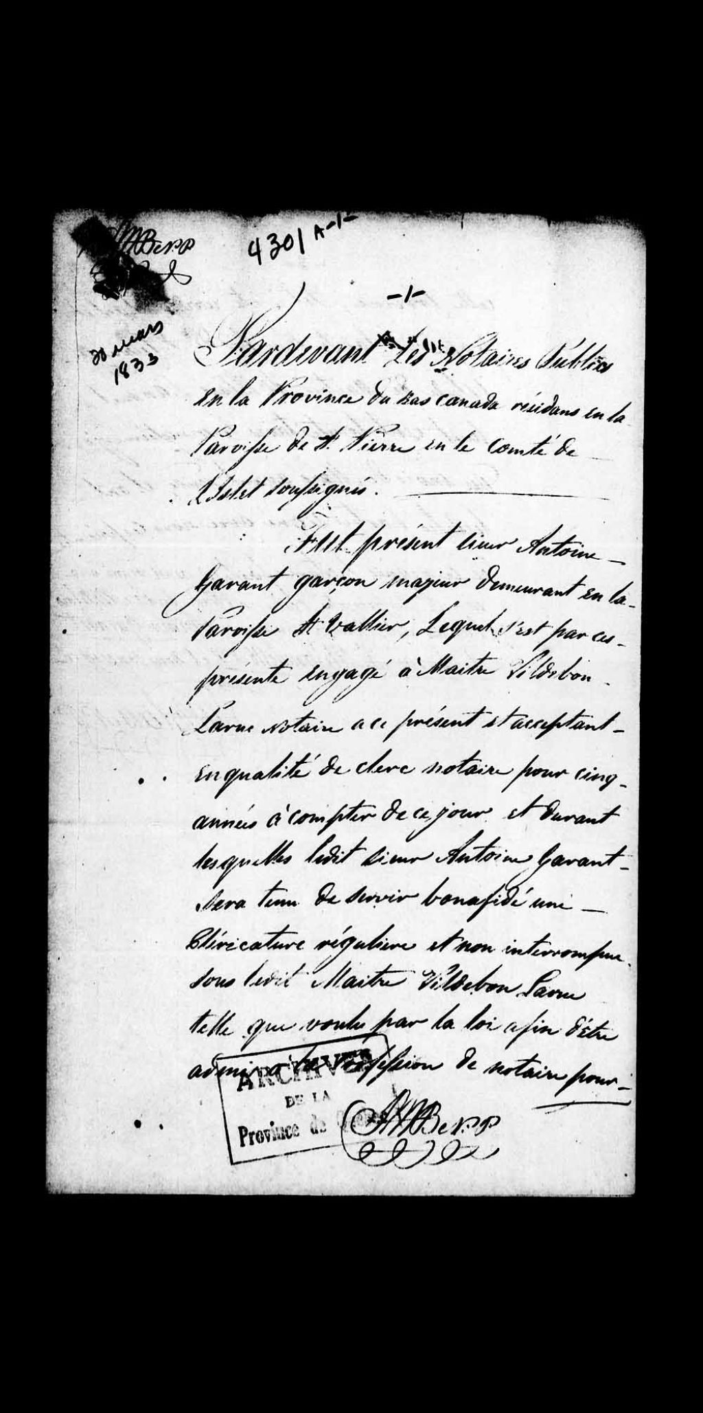 Admission à la pratique du notariat de Antoine Garant, garçon majeur, né dans la paroisse de Saint-Gervais en France, le 27 décembre 1808, fils de Jean-Baptiste Garant, cultivateur et de Marie-Reine Dagneau, Antoine Godbout, demeurant en la paroisse de Saint-Vallier, engagé à monsieur Vildebon Larue, notaire, ledit Garant