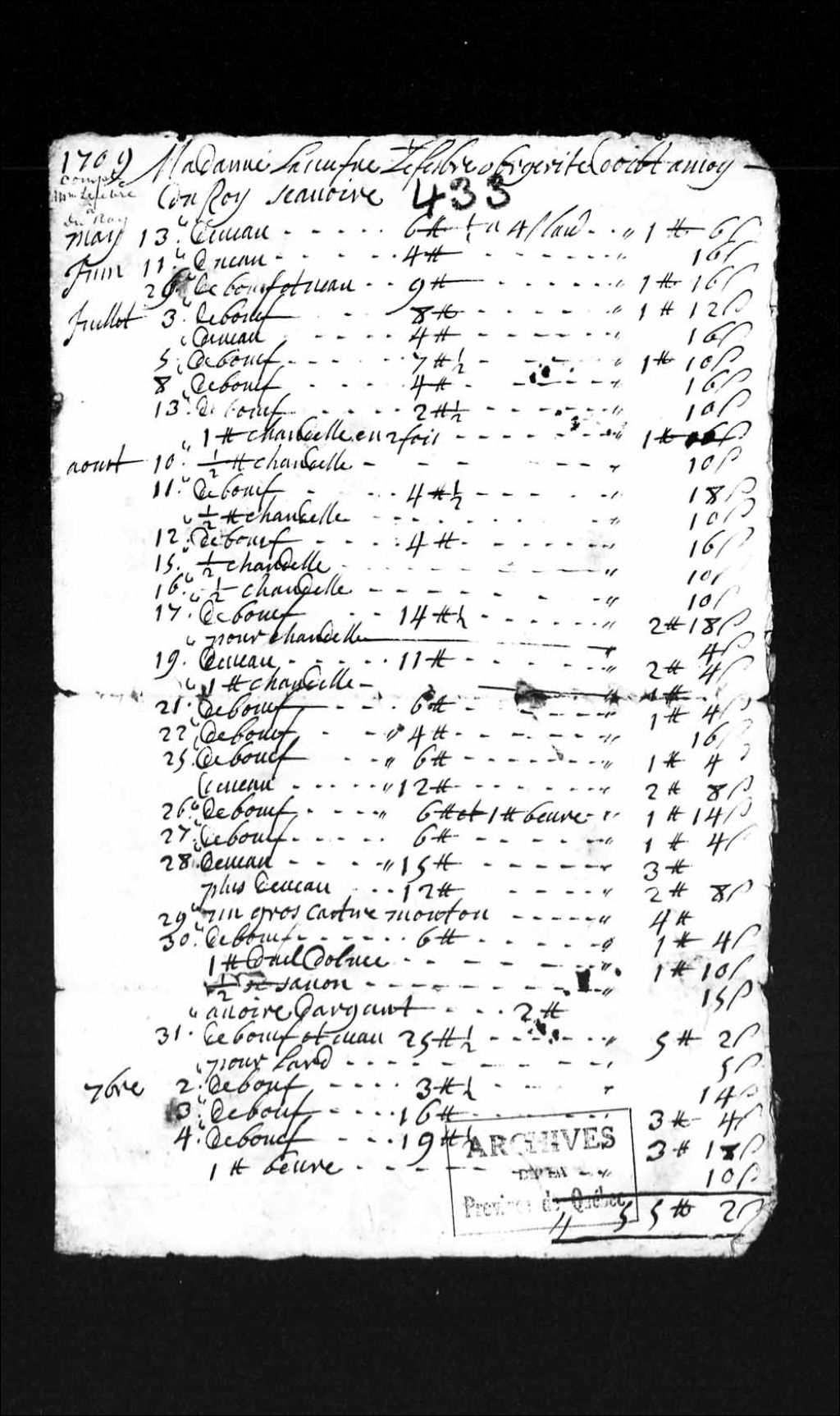 - Compte de la veuve d'Edmond Lefebvre, aubergiste à madame Duroy, du 13 mai 1709 au 17 janvier 1715