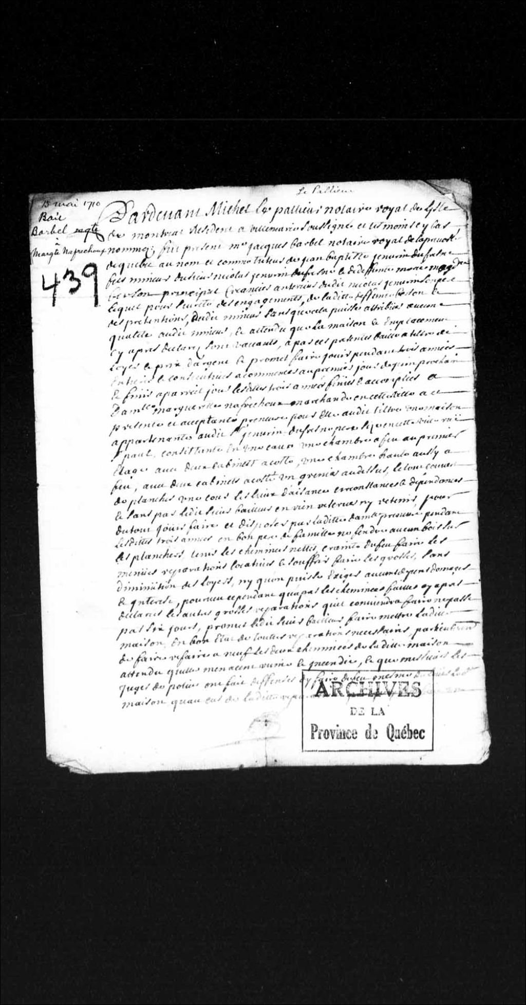Bail d'une maison et emplacement par Jacques Barbel, notaire royal de la Prévôté de Québec, tuteur de Jean-Baptiste Janvrin Dufresne à demoiselle Marguerite Nafrechou (Nafrechoux), marchande de Montréal, 15 mai 1710, Archives nationales à Québec, Collection Pièces judiciaires et notariales, (03Q,TL5,D439).