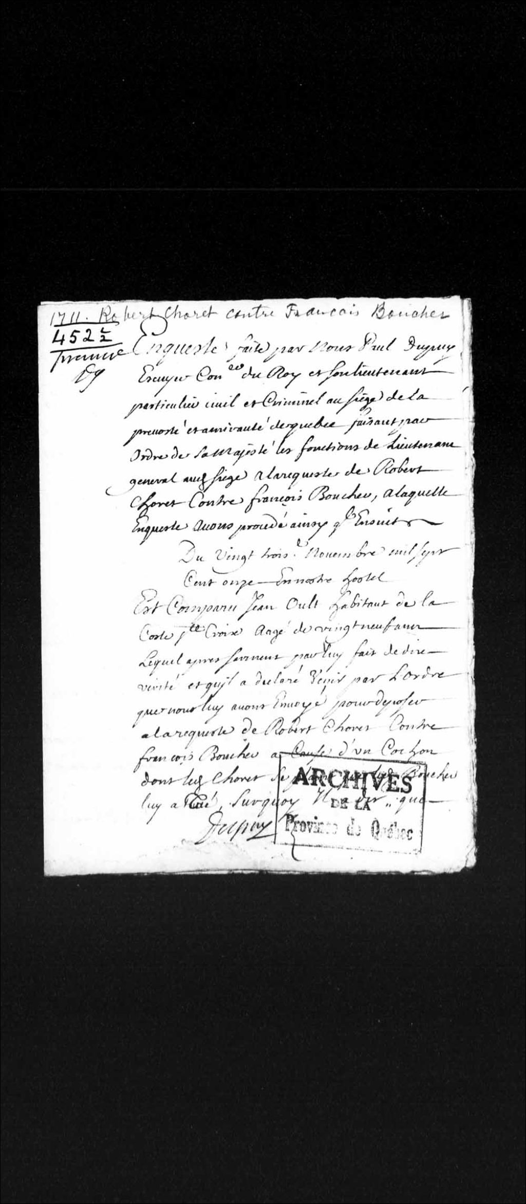 - Enquête faite par le lieutenant particulier de la Prévôté et Amirauté de Québec, Paul Dupuy, à la requête de Robert Choret contre François Boucher, à propos d'un cochon, que ledit Boucher aurait tué d'un coup de fusil