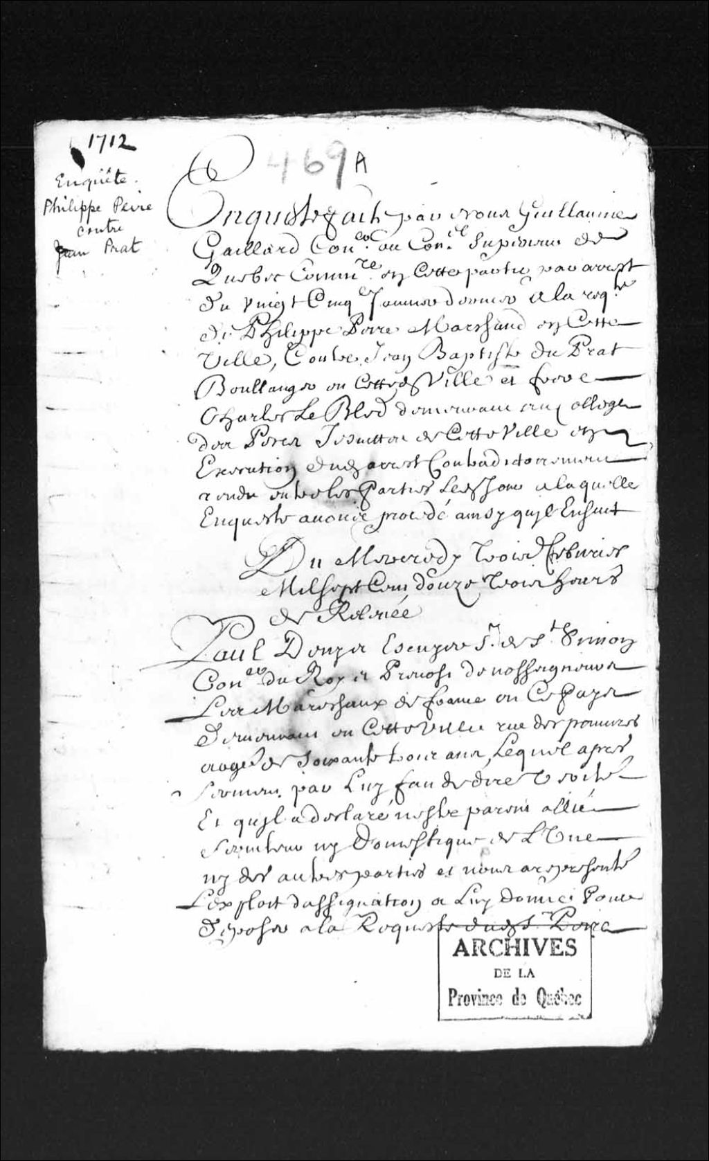 - Ce dossier en matières civiles provient du Conseil supérieur de Québec et contient les interrogatoires ou les dépositions des personnes suivantes : Paul Denis, écuyer, sieur de Saint-Simon, conseiller du Roi, prévôt des maréchaux de France en ce pays, demeurant à Québec, 63 ans; Guillaume Pagé dit Carsy, brasseur de bière, demeurant à Québec, rue Saint-Pierre, 55 ans; Jean Meschin (Méchin), huissier audiencier en la Prévôté de Québec, demeurant rue du Sault-au-matelot, 35 ans; Louis Sauvageon, soldat canonnier de la Compagnie de Beaucours, demeurant au Séminaire de Québec, 42 ans; Etienne Dubreuil, notaire en la Prévôté de Québec, demeurant rue Saint-Joseph, 42 ans. Ce dossier comprend l'enquête faite par Guillaume Gaillard, conseiller au Conseil supérieur de Québec, commissaire par arrêt du Conseil du 5 janvier 1712, sur les faits mentionnés en une sentence rendue en la Prévôté, le 11 décembre 1711; un procès-verbal dudit sieur Gaillard sur l'audience de la cause