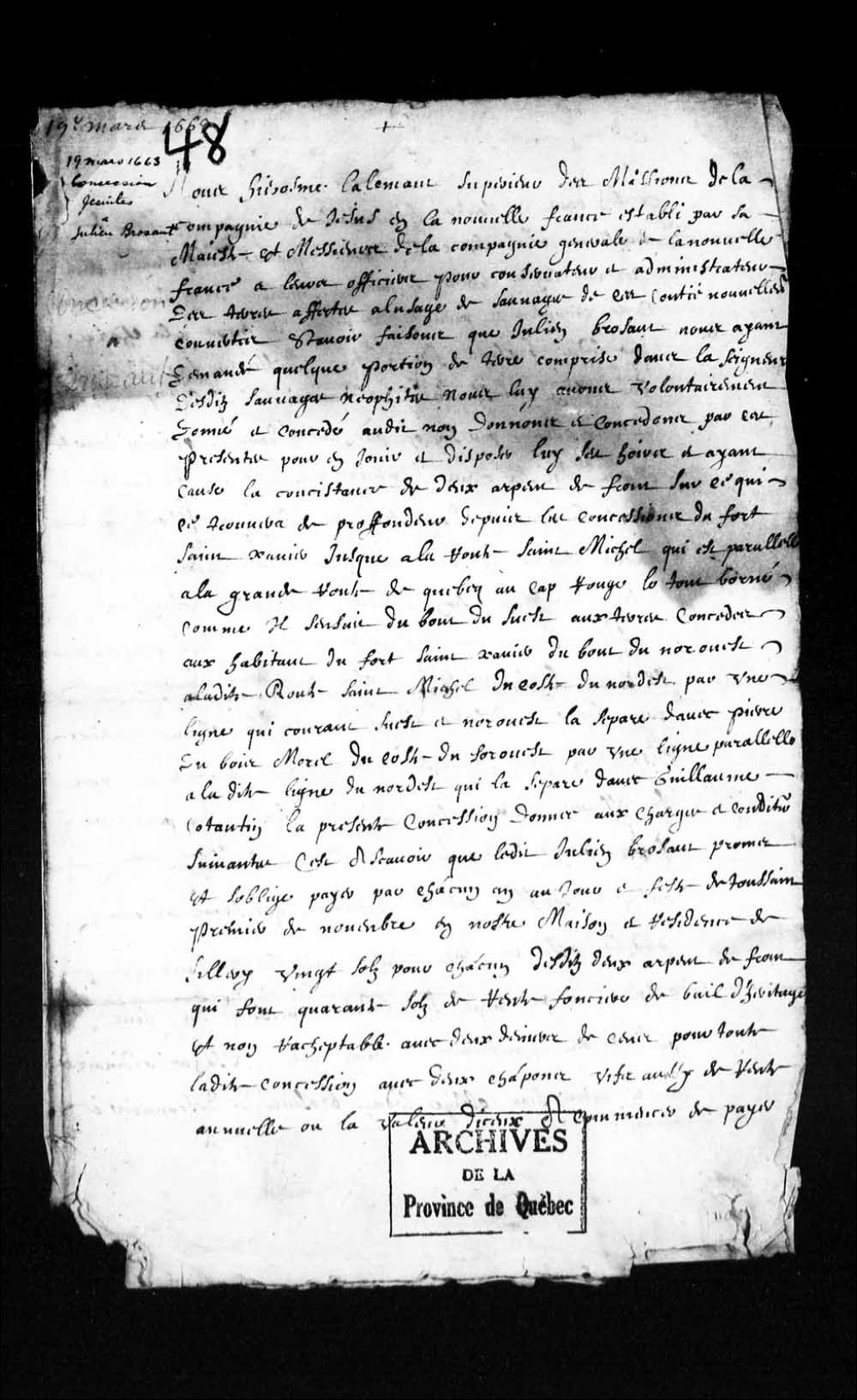 Concession d'une terre vers le Cap-Rouge, dans la seigneurie des sauvages néophytes (Amérindiens) par Jérôme Lalemant, supérieur des Misions de la Compagnie de Jésus en Nouvelle-France (Jésuites) à Julien Brosans, en présence de Nicolas Gaudry, 19 mars 1663, Archives nationales à Québec, Collection Pièces judiciaires et notariales, (03Q,TL5,D48).