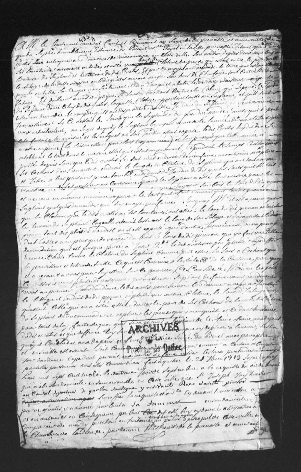 - Ce dossier en matières civiles provient de la Prévôté de Québec et du Conseil supérieur de Québec. Il comprend des requêtes d'Étienne Dubreuil, adressées à la Prévôté de Québec et au Conseil supérieur de Québec; une ordonnance de la Prévôté de Québec, pour la visite de la clôture (en deux copies); procès-verbaux du huissier Hilaire Bernard (Besnard) de Larivière, nommé arbitre par la Prévôté dans ce différend; les griefs que produit Pierre Gratis au Conseil supérieur de Québec, appelant de la sentence rendue à la Prévôté, le 10 octobre 1713