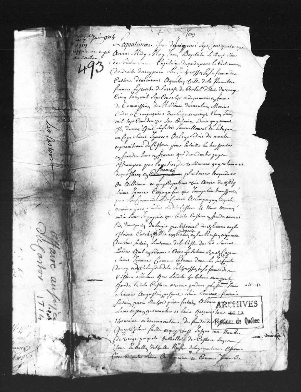 Déclaration adressée à la Compagnie par Jean-Baptiste Leboeuf (Lebeuf), sieur de Sainte-Marie, capitaine des gardes pour la conservation des droits du Roi pour les intéressés en la Ferme des castors, au sujet de castors entreposés au Cap Saint-Ignace, chez le sieur Fortain (Fortin), lieutenant de la Côte-du-Sud, et que l'on aurait transporté en fraude en France ou dans d'autres pays étrangers, par les vaisseaux qui sont retournés de Québec, en France, à Plaisance (Terre-Neuve) ou en Acadie, 4 mai 1714, Archives nationales à Québec, Collection Pièces judiciaires et notariales, (03Q,TL5,D493).