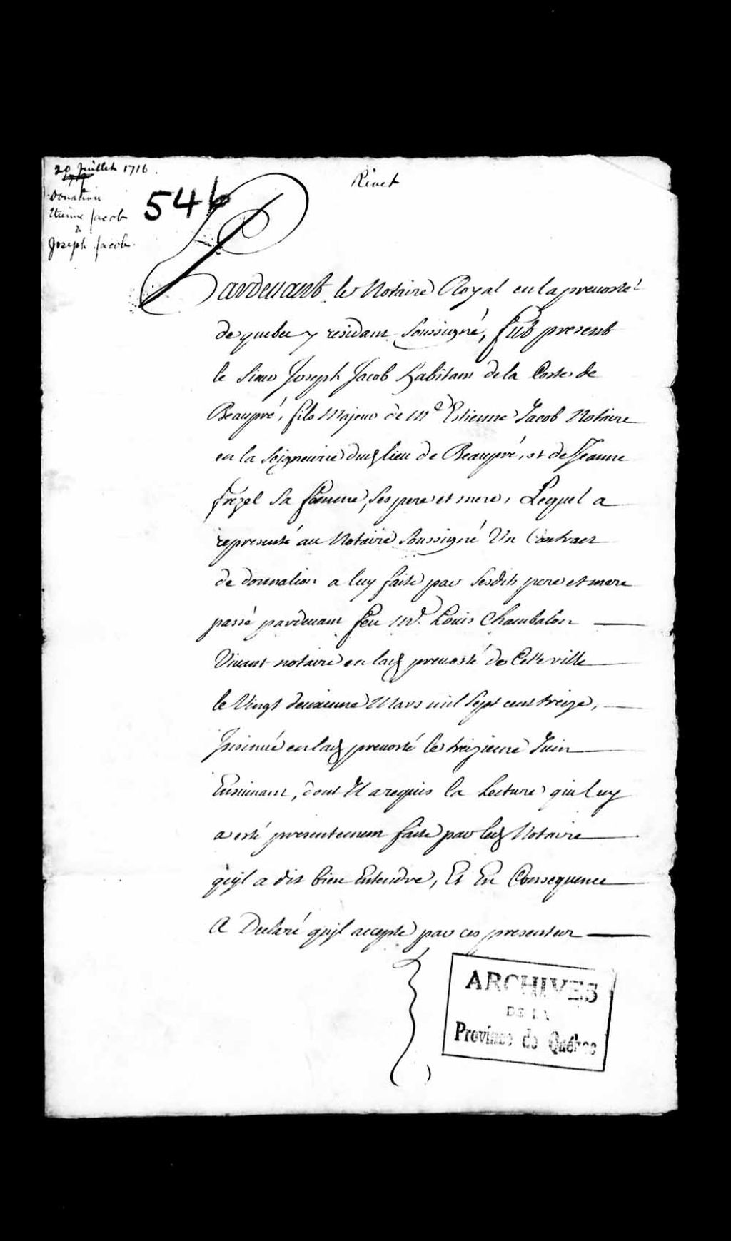 - Acceptation par Joseph Jacob, habitant de la côte de Beaupré, fils d'Étienne Jacob, notaire en la seigneurie de Beaupré et de Jeanne Fressel, d'une donation qui lui a été faite par ses père et mère, devant Louis Chambalon, notaire de la Prévôté de Québec, le 22 mars 1713