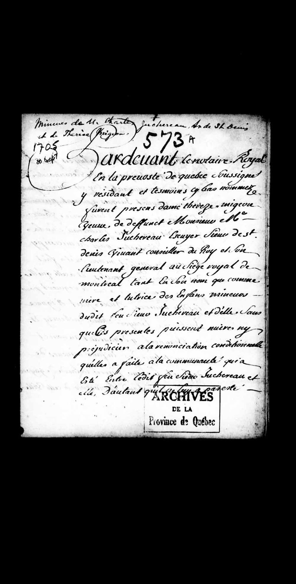 - Procès de Marie-Catherine Peuvret, veuve de feu Ignace Juchereau, contre les enfants mineurs de feu Charles Juchereau, écuyer et sieur de Saint-Denis, vivant conseiller du Roi et son lieutenant général au siège de la Juridiction royal de Montréal, et de Thérèse Migeon, tutrice des mineurs, épouse en secondes noces de Louis Liénard, sieur de Beaujeu