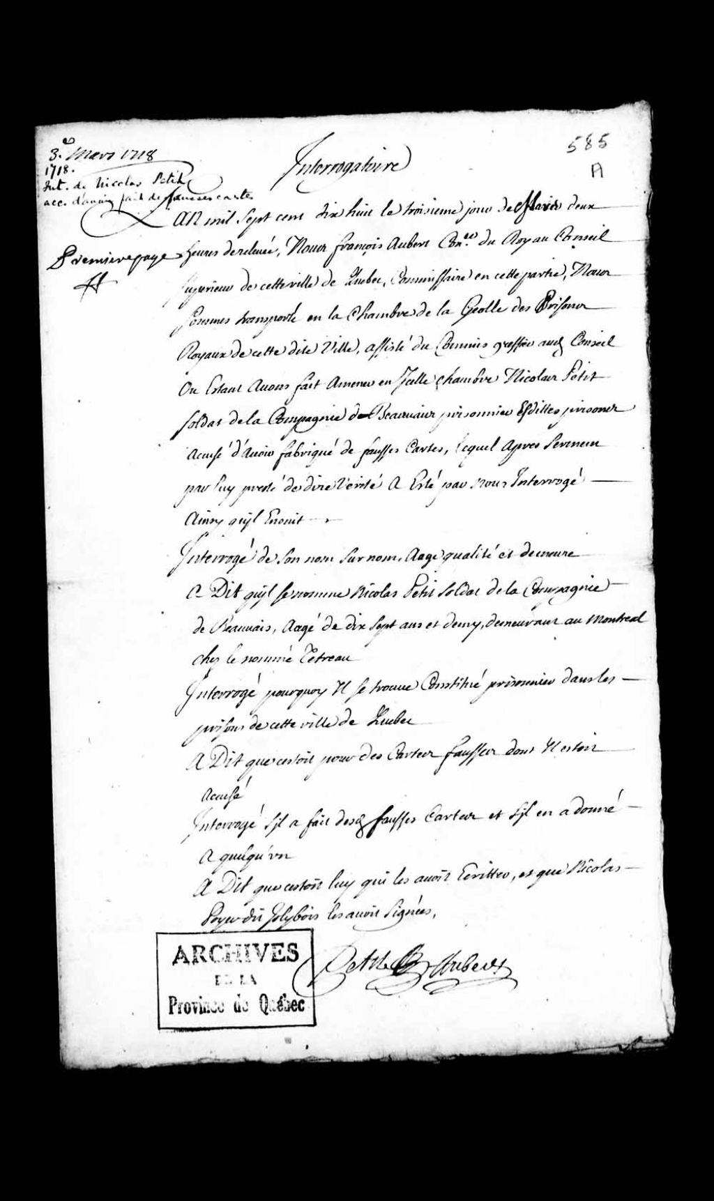 - Procédure au sujet de l'évasion des prisons de Québec de Paul-Alexandre Vallée, soldat de Duvivier, de Nicolas Petit, soldat de la compagnie de Beauvais, âgé de 17 ans, de Jacques Laroche dit Léveillé, tambour de la compagnie de Saint-Pierre, âgé de 17 ans, demeurant chez le nommé Saint-Jean, cabaretier de Montréal, de Nicolas Poyer dit Jolibois, soldat de la compagnie de LaCorne, âgé de 29 ans, de Pierre Vendard (Vandard) dit Vincent, sergent de la compagnie de Jordy, âgé de 22 ans et du nommé Petitet, soldat d'Amariton, tous accusés d'avoir fabriqué de la monnaie de cartes
