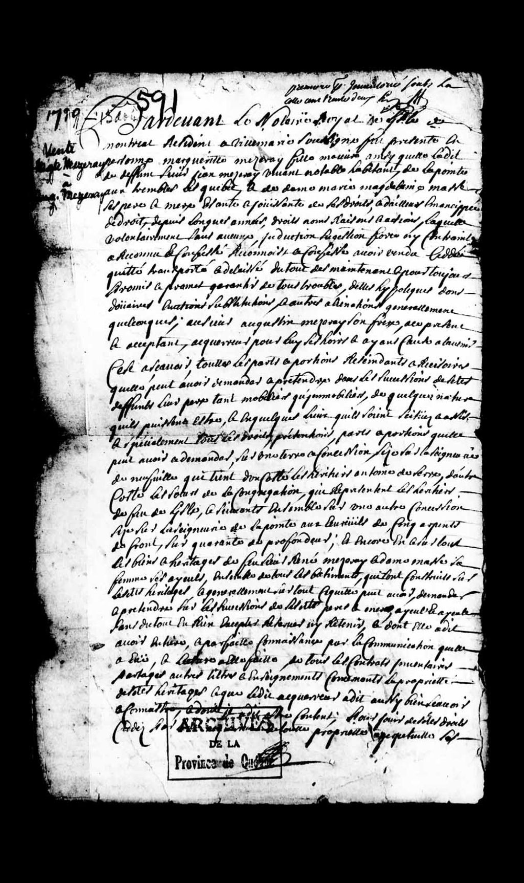 Vente de droits successifs mobiliers et immobiliers sur une terre située en la seigneurie de Neuville, par Marguerite Mezeray, fille de feu Jean Mezeray, vivant notable habitant de la Pointe-aux-Trembles, et de Marie-Madeleine Masse, ses père et mère à Augustin Mezeray, son frère, 13 août 1719, Archives nationales à Québec, Collection Pièces judiciaires et notariales, (03Q,TL5,D591).