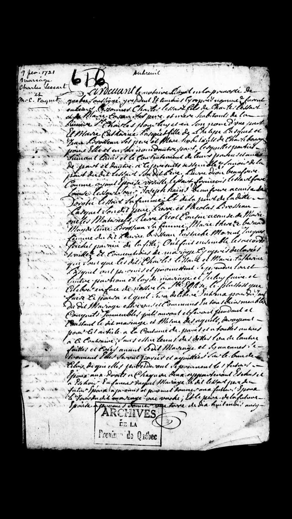 Contrat de mariage de Charles Lessard (Lessart), fils de Charles Lessard et de Marie Caron, habitants de la Rivière Saint-Charles, d'une part et de Marie-Catherine Paquet, fille de Philippe Paquet et Jeanne Brosseau, habitants de Charlesbourg, d'autre part, 9 février 1721, Archives nationales à Québec, Collection Pièces judiciaires et notariales, (03Q,TL5,D616).