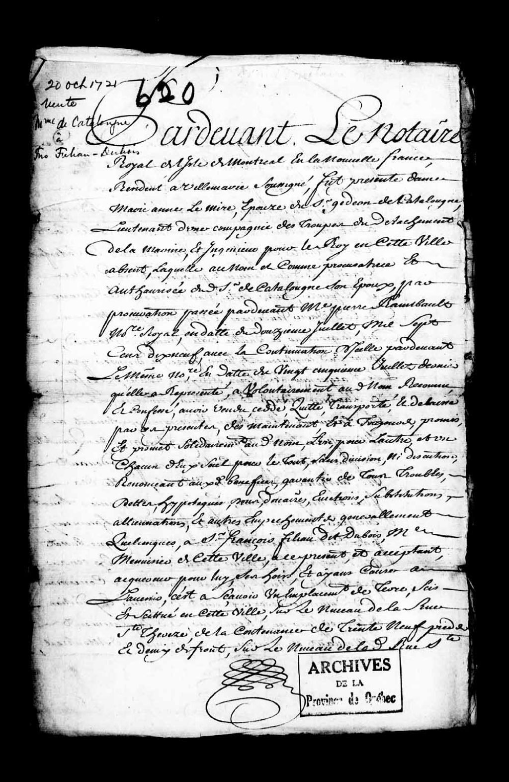 - Vente par Marie-Anne Lemire, épouse de Gédéon de Catalogne, lieutenant d'une compagnie des troupes de la marine et ingénieur pour le Roi, au nom et comme procuratrice de son mari, à François Filiau dit Dubois, maître menuisier de Montréal, d'un emplacement situé à Montréal, situé au niveau de la rue Sainte-Thérèse