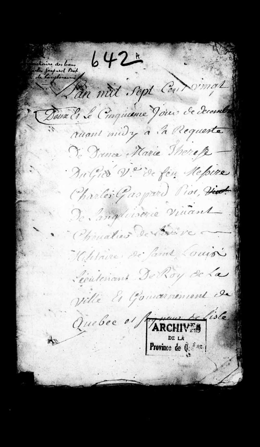 Inventaire des biens du défunt Charles Gaspard Piot, sieur de Langloiserie, lieutenant de Roi de la ville et gouvernement de Québec, chevalier de l'ordre de Saint-Louis, seigneur de l'île Sainte-Thérèse et île adjacente, à la requête de sa femme Marie-Thérèse Dugué