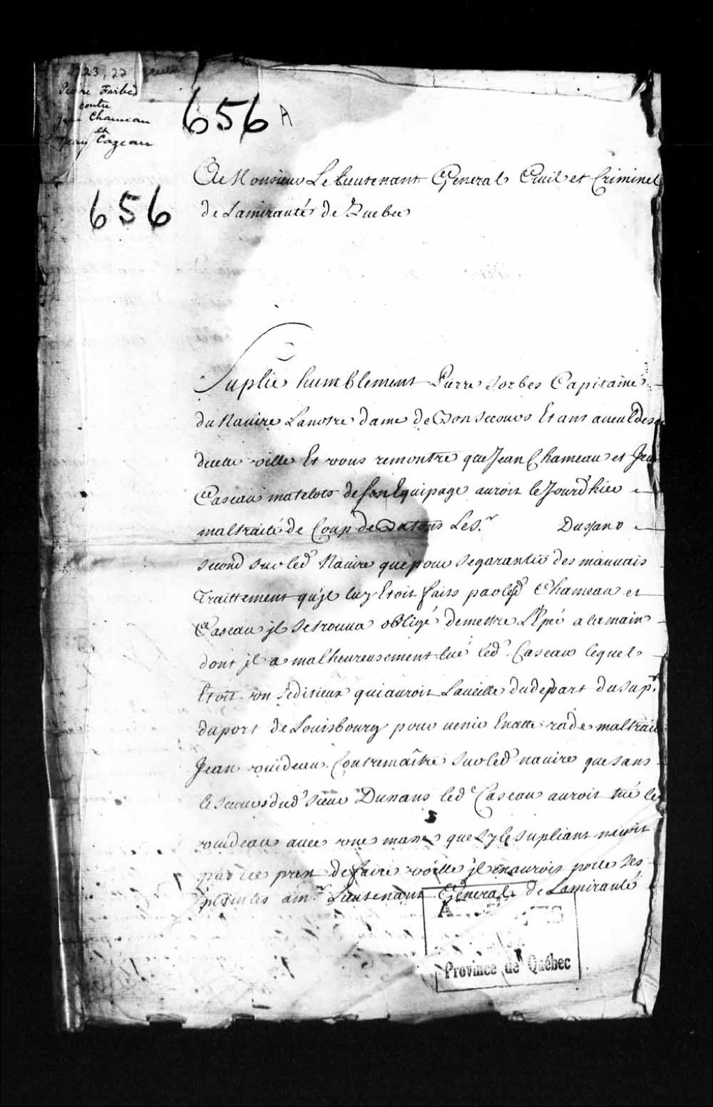 - Procès criminel relatif au meurtre de Jean Caseau, matelot par Michel Duzeau, second du navire le «Notre-Dame de Bon Secours»; Pierre Sorbes (Pierre Forbes), capitaine du navire le «Notre-Dame de Bon-Secours», se porte à la défense de Duzeau, à l'effet que ce dernier aurait tué (meurtre) Caseau pour se défendre des mauvais traitements que lui avait infligés Caseau ainsi que Guillaume (Jean) Chameau