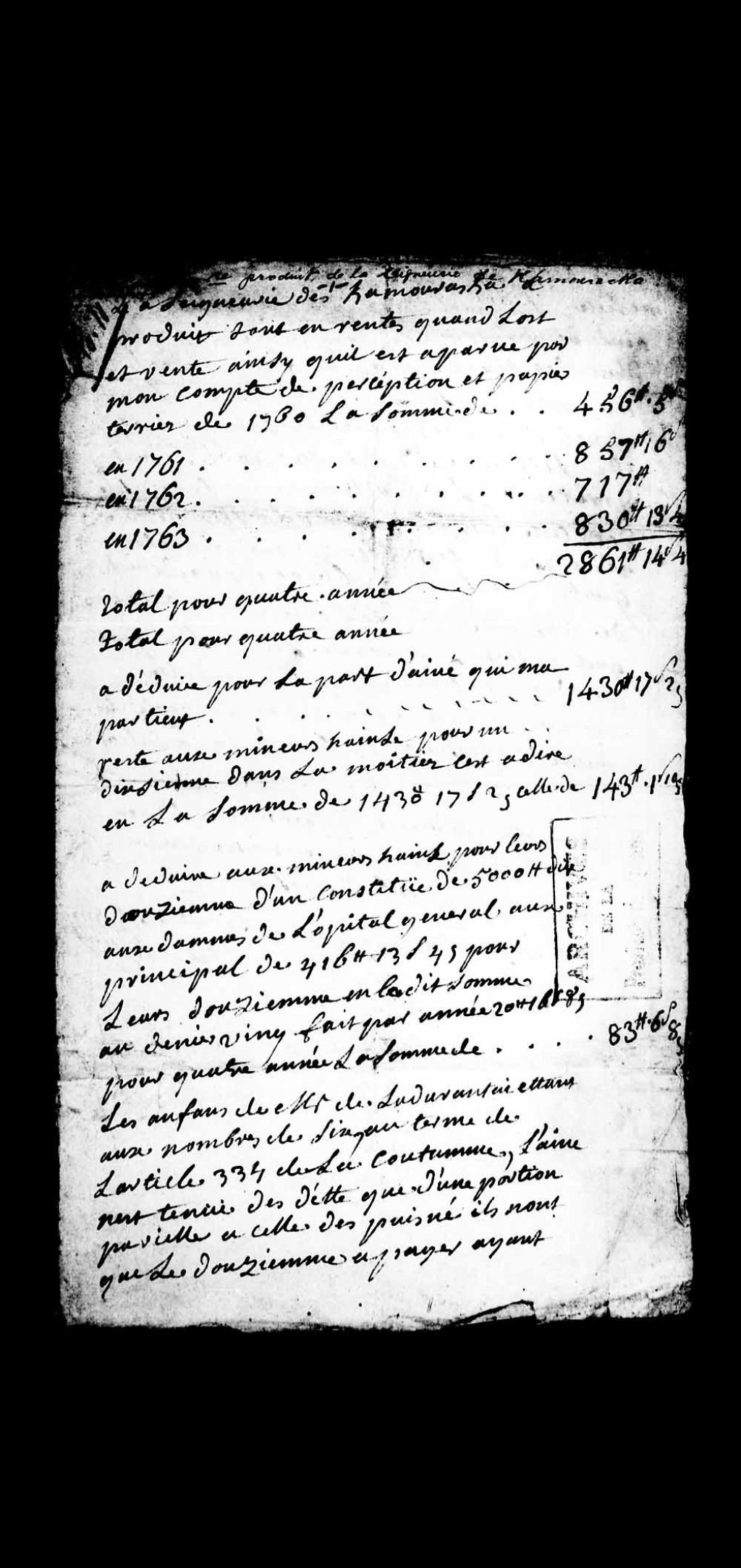 Compte de Decharnay, relatif au produit de la seigneurie de Kamouraska, cens, rentes, lots et ventes, présenté au tuteur des six enfants mineurs de monsieur de La Durantaye, le sieur Clément Lainse (Hainse - Hains)
