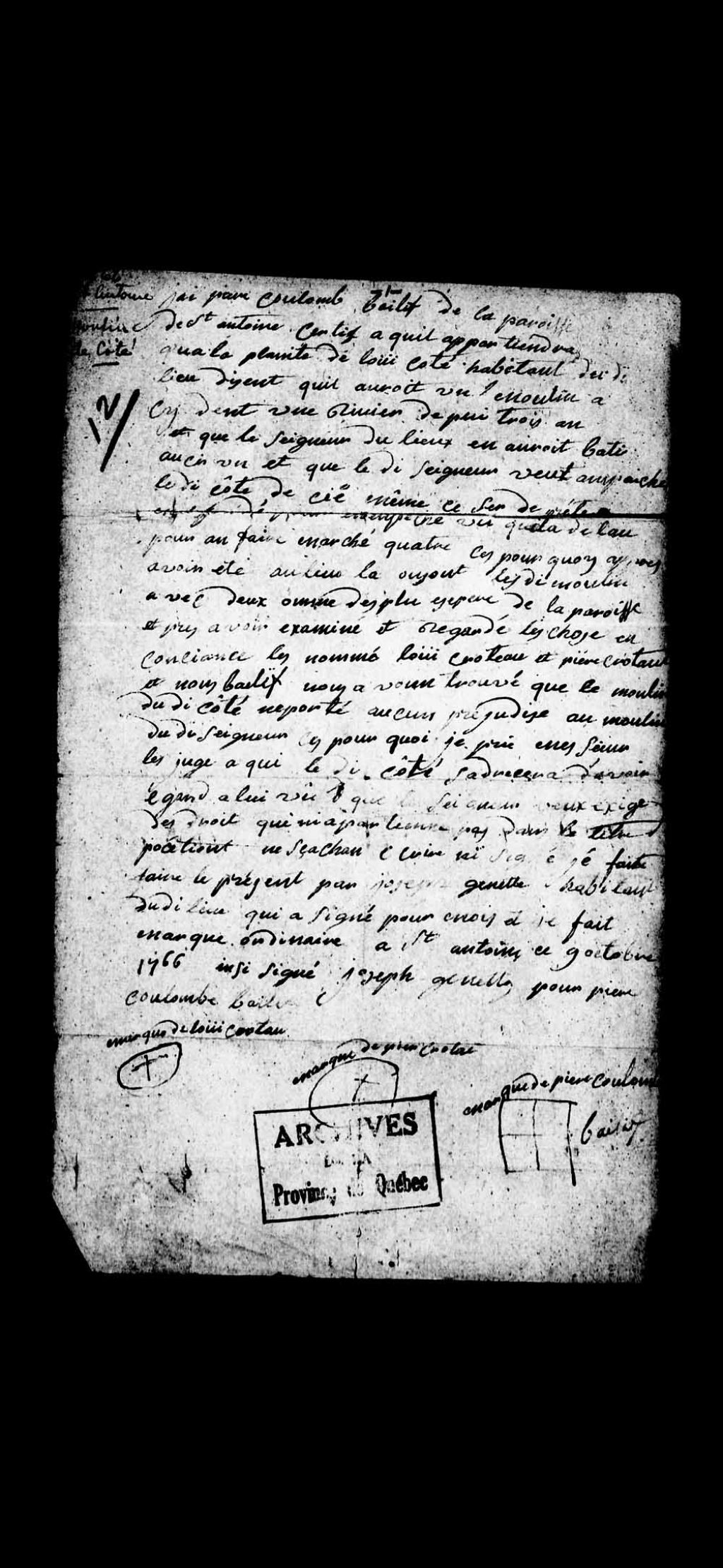 Procès-verbal du baillif (juge bailli) de Saint-Antoine de Tilly, Pierre Coulombe, de la visite du moulin à scie, situé à Saint-Antoine-de-Tilly, appartenant à Louis Côté et recommandations dudit Coulombe, aux juges à qui ledit Côté s'adressera, dans sa cause l'opposant au seigneur des lieux qui a fait construire un moulin, au préjudice de celui dudit Côté, 9 octobre 1766, Archives nationales à Québec, Collection Pièces judiciaires et notariales, (03Q,TL5,D69012).