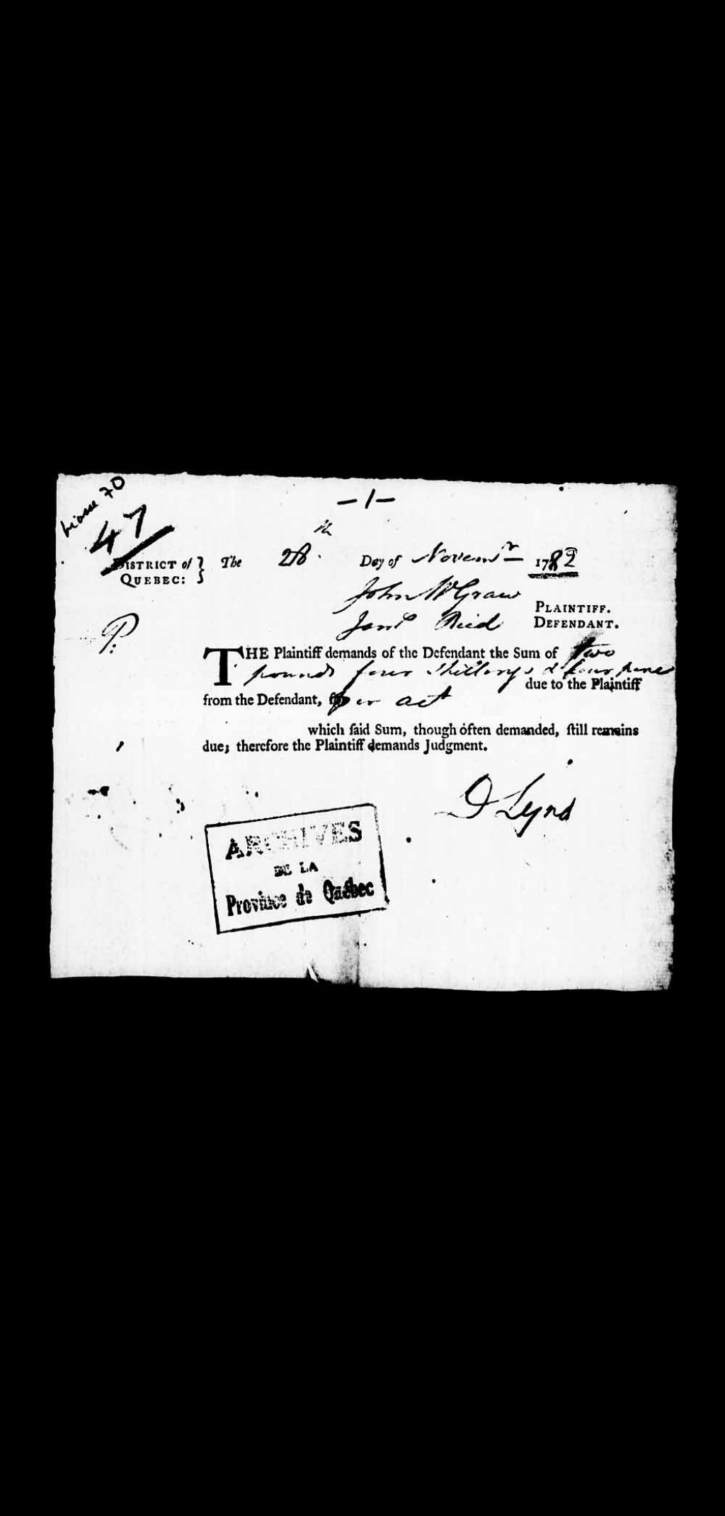 Sommation dans la cause de John McCraw, demandeur, contre James Reid, défendeur, pour la somme de 2 pounds, 4 shillings, 4 pences; l'audience se tiendra à la Chambre de la Cour dans la ville de Québec, devant le juge P. Panet, 28 novembre 1782, Archives nationales à Québec, Collection Pièces judiciaires et notariales, (03Q,TL5,D70047).